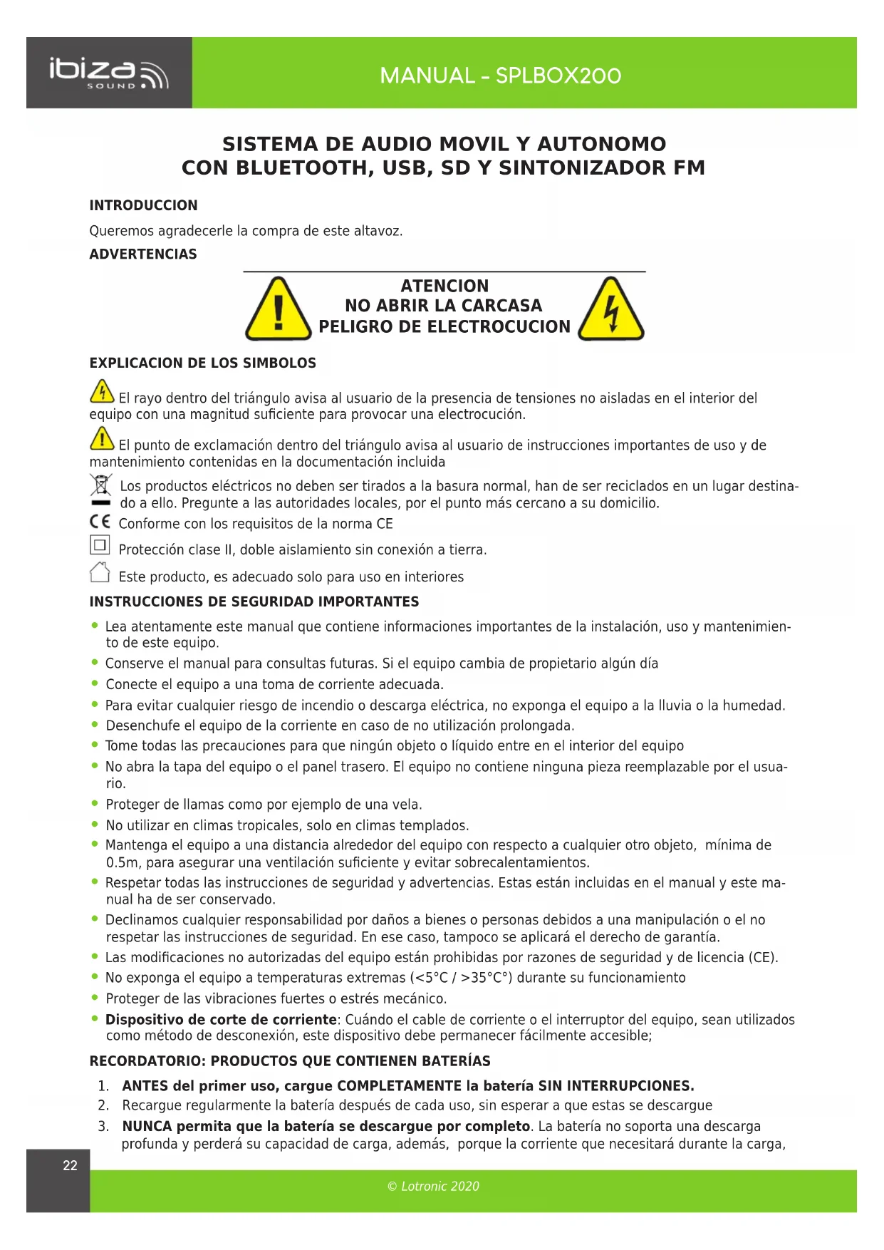 - Dispositivo de corte de corriente: Cuándo el cable de corriente o el interruptor del equipo, sean utilizados como método de desconexión, este dispositivo debe permanecer fácilmente accesible;RECORDATORIO: PRODUCTOS QUE CONTIENEN BATERÍAS1. ANTES del primer uso, cargue COMPLETAMENTE la batería SIN INTERRUPCIONES. 2. Recargue regularmente la batería después de cada uso, sin esperar a que estas se descargue 3. NUNCA permita que la batería se descargue por completo. La batería no soporta una descarga profunda y perderá su capacidad de carga, además, porque la corriente que necesitará durante la carga,MANUAL - SPLBOX200