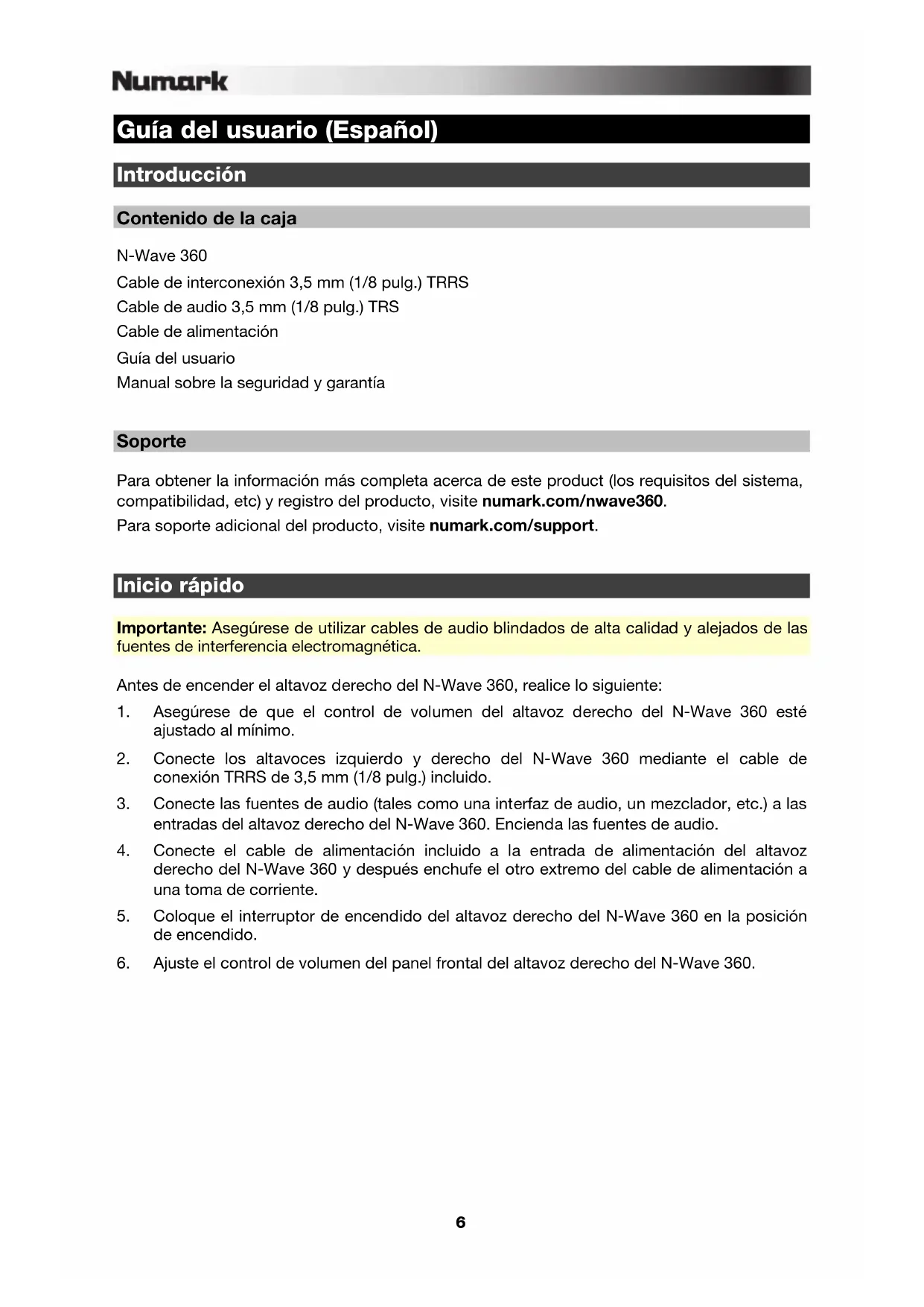 Soporte Para obtener la información más completa acerca de este product (los requisitos del sistema, compatibilidad, etc) y registro del producto, visite numark.com/nwave360. Para soporte adicional del producto, visite numark.com/support.