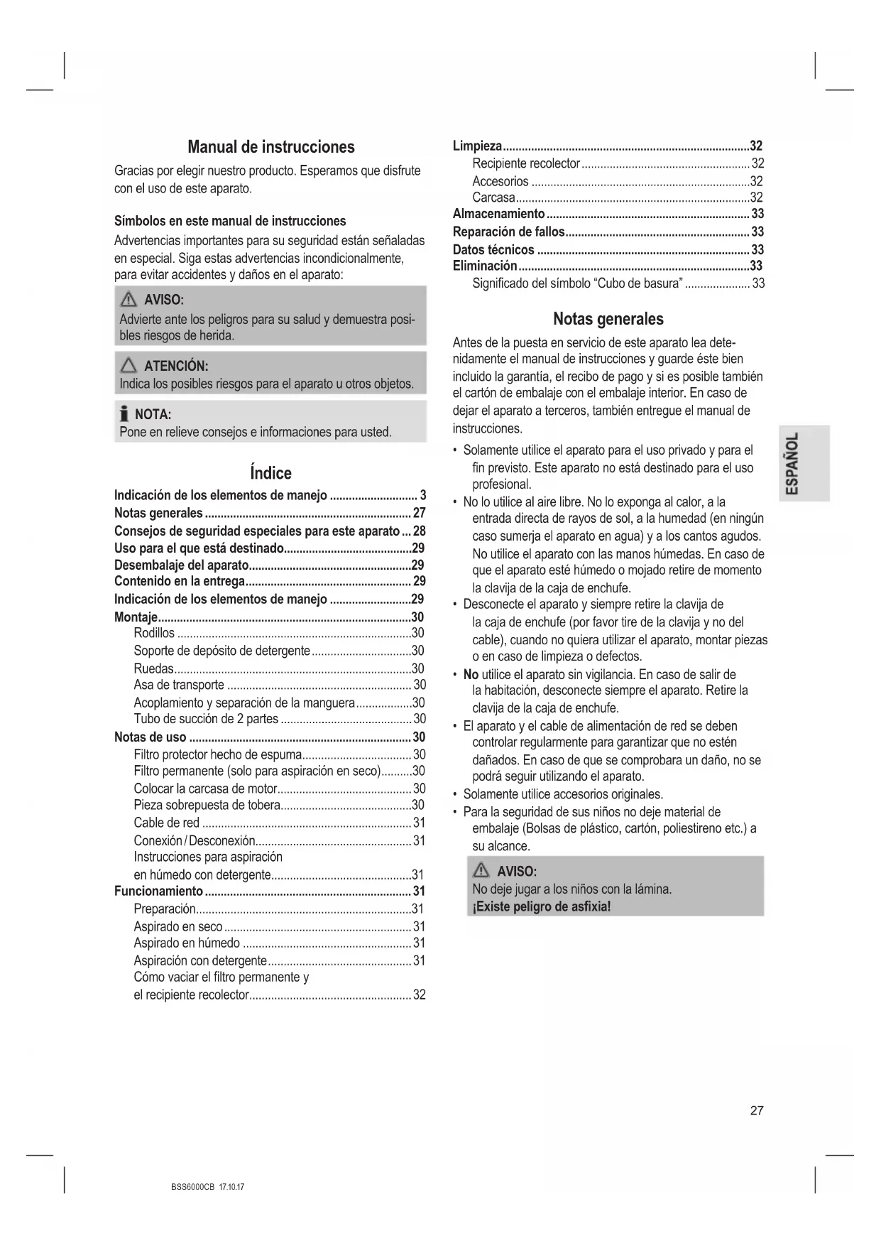- Los niños no deben jugar con el aparato.BSS6000CB 17.10.17