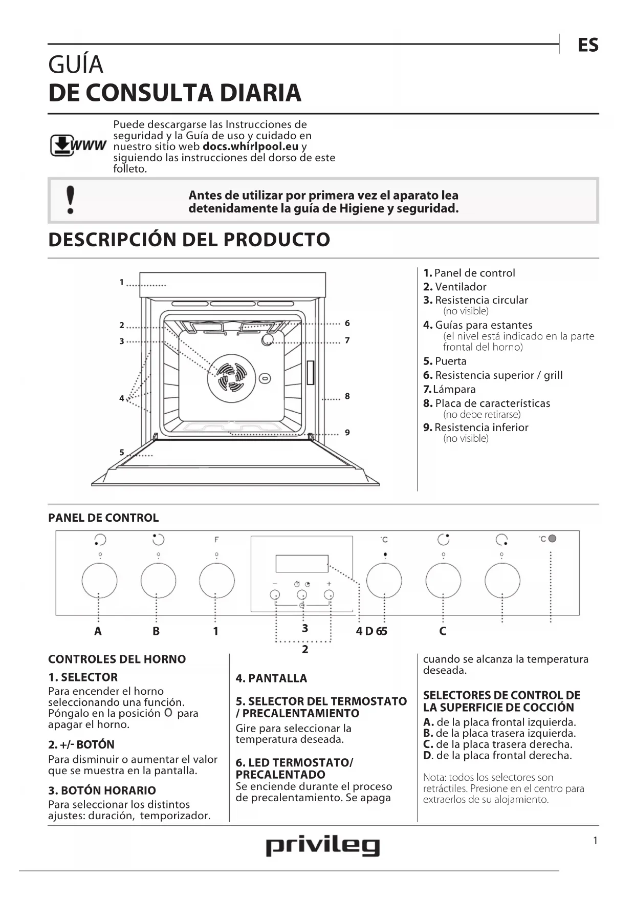 Antes de utilizar por primera vez el aparato lea detenidamente la guía de Higiene y seguridad. WWW Puede descargarse las Instrucciones de seguridad y la Guía de uso y cuidado en nuestro sitio web docs.whirlpool.eu y siguiendo las instrucciones del dorso de este folleto.
