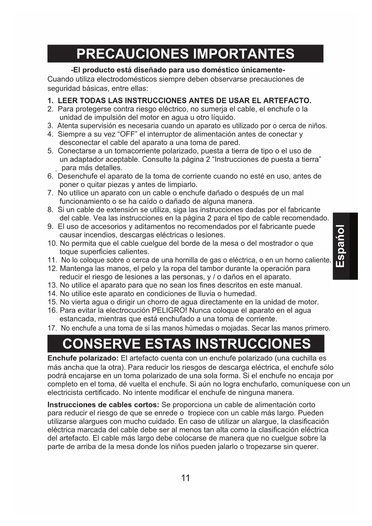 Enchufe polarizado: El artefacto cuenta con un enchufe polarizado (una cuchilla es más ancha que la otra). Para reducir los riesgos de descarga eléctrica, el enchufe sólo podrá encajarse en un toma polarizado de una sola forma. Si el enchufe no encaja por completo en el toma, dé vuelta el enchufe. Si aún no logra enchufarlo, comuníquese con un electricista certicado. No intente modicar el enchufe de ninguna manera. Instrucciones de cables cortos: Se proporciona un cable de alimentación corto para reducir el riesgo de que se enrede o tropiece con un cable más largo. Pueden utilizarse alargues con mucho cuidado. En caso de utilizar un alargue, la clasicación eléctrica marcada del cable debe ser al menos tan alta como la clasicación eléctrica del artefacto. El cable más largo debe colocarse de manera que no cuelgue sobre la parte de arriba de la mesa donde los niños pueden jalarlo o tropezarse sin querer.12 Espańol Instrucciones de Puesta a Tierra Los Cables de Extensión Este aparato está equipado con un cable de 3 conductores y 3 clavijas (NEMA 5-15P) para encajar en 15A estándar aterrizado, (NEMA 5-15R). El aparato debe estar conectado a tierra mientras se usa para proteger al usuario de un peligro de electrocución o choque. Conexión a tierra del adaptador se puede utilizar si está utilizando un recipiente de 2 conductores. Los medios de puesta a tierra, que se extiende desde el cuerpo del adaptador, debe estar conectado al tornillo en una caja de enchufe con toma de tierra. Vea el diagrama de referencia. Conexión a tierra Adaptador 3 conductores A tierra De salida (NEMA 5-15R) Enchufe de conexión a tierra con puesta a tierra Pin (NEMA 5-15P) Conexión a tierra Medios 2 conductores Toma de corriente. (NEMA 1-15R) Centro de tornillo a tierra Conexión a tierra Tornillo Utilice sólo cable de extensión polarizado a tierra de tipo que es de 15A (mínimo). Le recomendamos que utilice un cable de extensión que se destina para el uso al aire libre. No utilice extensiones dañadas. Los cables de extensión son sólo para ser utilizada con nes temporales. No reemplazan la necesidad de la instalación de puntos de venta y el cableado adecuado cuando sea necesario. No tire del cable para desconectarlo. Mantener alejado del calor y objetos losos.13 Espańol Manual de Instrucciones