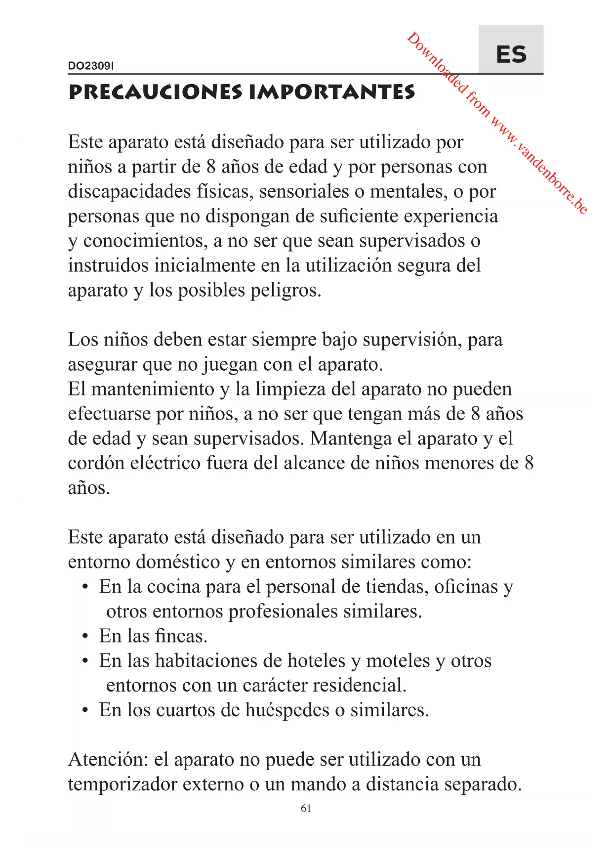 PRECAUCIONES IMPORTANTES Este aparato está diseñado para ser utilizado por niños a partir de 8 años de edad y por personas con discapacidades físicas, sensoriales o mentales, o por personas que no dispongan de suciente experiencia y conocimientos, a no ser que sean supervisados o instruidos inicialmente en la utilización segura del aparato y los posibles peligros. Los niños deben estar siempre bajo supervisión, para asegurar que no juegan con el aparato. El mantenimiento y la limpieza del aparato no pueden efectuarse por niños, a no ser que tengan más de 8 años de edad y sean supervisados. Mantenga el aparato y el cordón eléctrico fuera del alcance de niños menores de 8 años. Este aparato está diseñado para ser utilizado en un entorno doméstico y en entornos similares como: