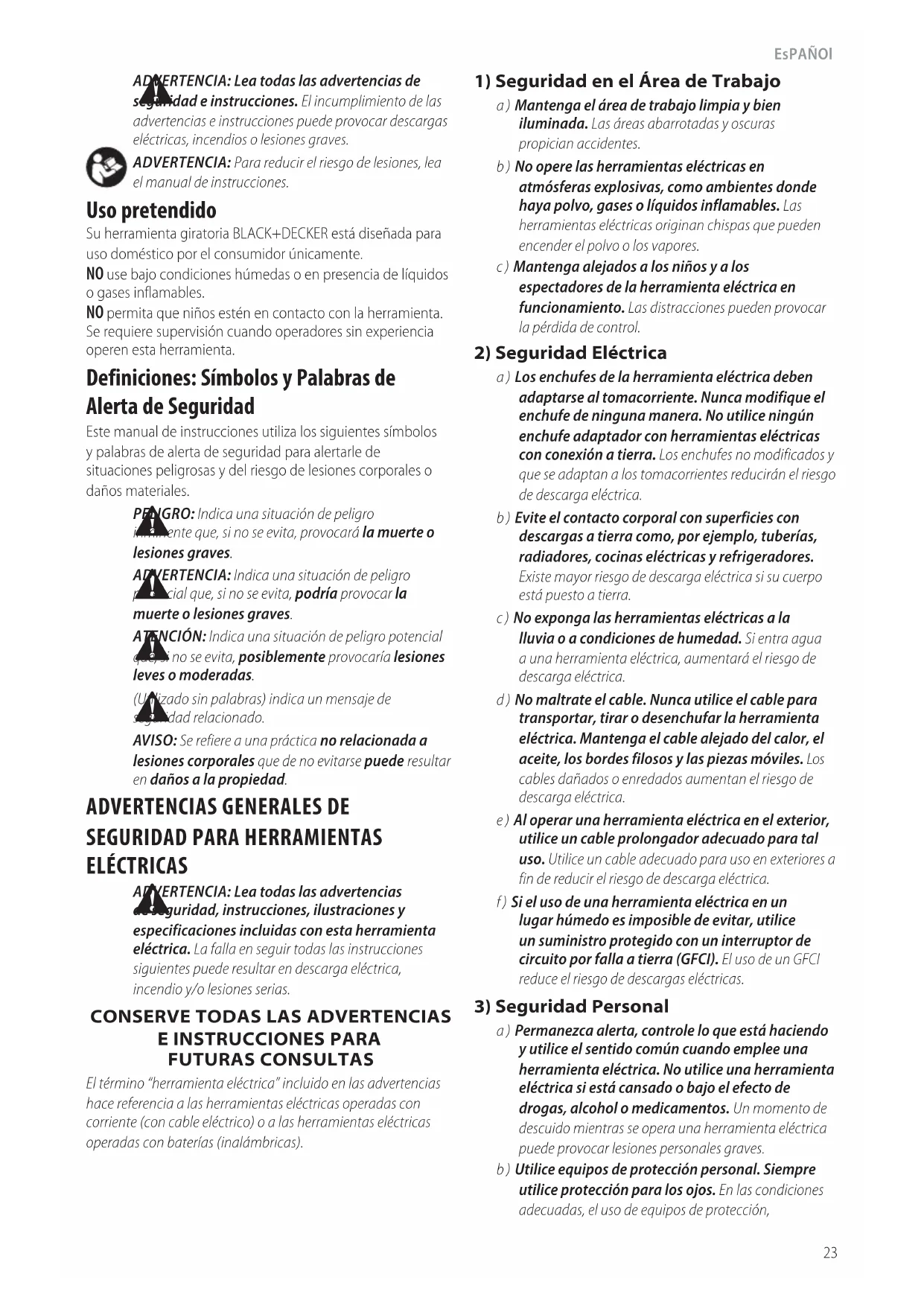 (Utilizado sin palabras) indica un mensaje de seguridadrelacionado. AVISO: Se refiere a una práctica no relacionada a lesiones corporales que de no evitarse puede resultar en daños a lapropiedad. Uso pretendido Su herramienta giratoria BLACK+DECKER está diseñada para uso doméstico por el consumidor únicamente. NO use bajo condiciones húmedas o en presencia de líquidos o gases inflamables. NO permita que niños estén en contacto con la herramienta. Se requiere supervisión cuando operadores sin experiencia operen esta herramienta. Español (traducido de las instrucciones originales)