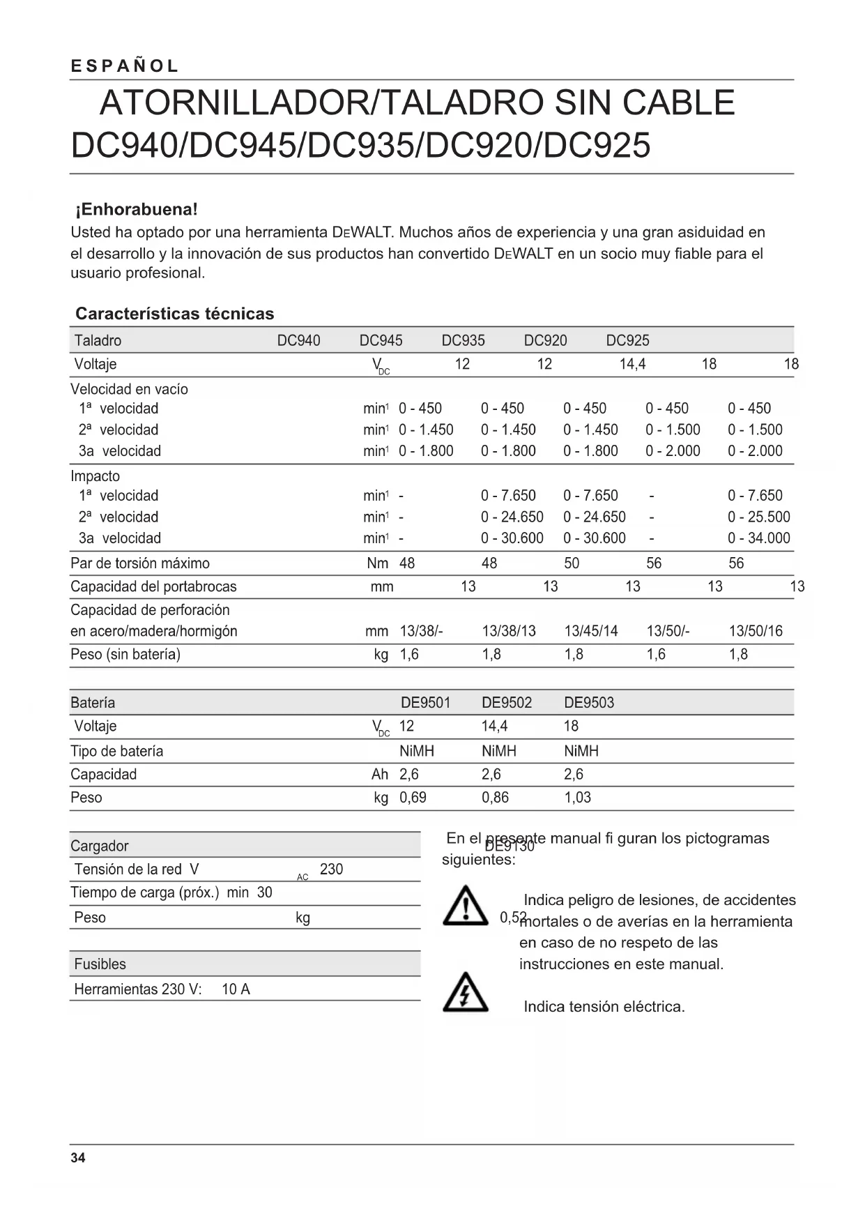 No arroje la batería al fuego Verifi cación del contenido del embalaje El paquete contiene: 1 Atornillador/taladro sin cable 1 Empuñadura lateral 1 Cargador 2 Baterías (modelos KB) 1 Caja de transporte 1 Manual de instrucciones 1 Dibujo despiezado Nota: Las baterías y los cargadores no se incluyen con los modelos N. ● Compruebe si la herramienta, piezas o accesorios han sufrido algún daño durante el transporte. ● Tómese el tiempo necesario para leer y comprender este manual antes de utilizar la herramienta. Descripción (fi g. A) El atornillador/taladro sin cable DC940/DC920 se ha diseñado para aplicaciones profesionales de perforación y atornillado. El atornillador/taladro percutor sin cable DC945/ DC935/DC925 se ha diseñado para aplicaciones profesionales de perforación, perforación con percusión y atornillado. 1 Conmutador de velocidad variable 2 Guía de deslizamiento de avance/retroceso 3 Portabrocas sin llave/con autocierre 4 Selector de modo/collarín de regulación del par de torsión 5 Selección del modo/del par de torsión 6 Selector de tres velocidades 7 Soporte de la broca 8 Empuñadura 9 Empuñadura lateral 10 Batería39 ESPAÑOL Cargador El cargador DE9130 acepta baterías NiMH y NiCd D E WALT desde 7,2 hasta 18 V entre 1,3 a 2,6 Ah. 10 Batería 11 Pulsadores de arranque 12 Cargador 13 Indicador de carga (rojo) Autocierre Cuando la transmisión está inmóvil se engancha el autocierre. Puede girar fácilmente el casquillo con una mano y sujetar la herramienta con la otra. Seguridad eléctrica El cargador ha sido diseñado para un solo voltaje. Compruebe siempre que el voltaje de la red corresponde al valor indicado en la placa de características. Su cargador D E WALT tiene doble aislamiento, conforme a la norma EN 60745 & EN 60335; por consiguiente, no se requiere conexión a tierra. Sustitución de cable o enchufe Al sustituir el cable o el enchufe hágalo con sumo cuidado: un enchufe con conectores de cobre desprotegidos es peligroso si se conecta a una toma de corriente activa. Utilización de un cable de prolongación En caso de que sea necesario utilizar un cable de prolongación, deberá ser un cable de prolongación aprobado, adecuado para la potencia de esta herramienta (véanse las características técnicas). La sección mínima de conductor es de 1 mm