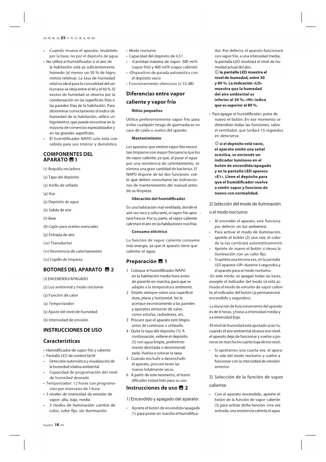 Con el aparato encendido, apriete el botón de la función de vapor caliente (3) para activar dicha función. Una vez activada, una resistencia calienta el agua19 / 44 Español EN FR NL DE ES IT PL CS SK SL HR BG en la base, actuando contra las bacterias y creando vapor caliente.