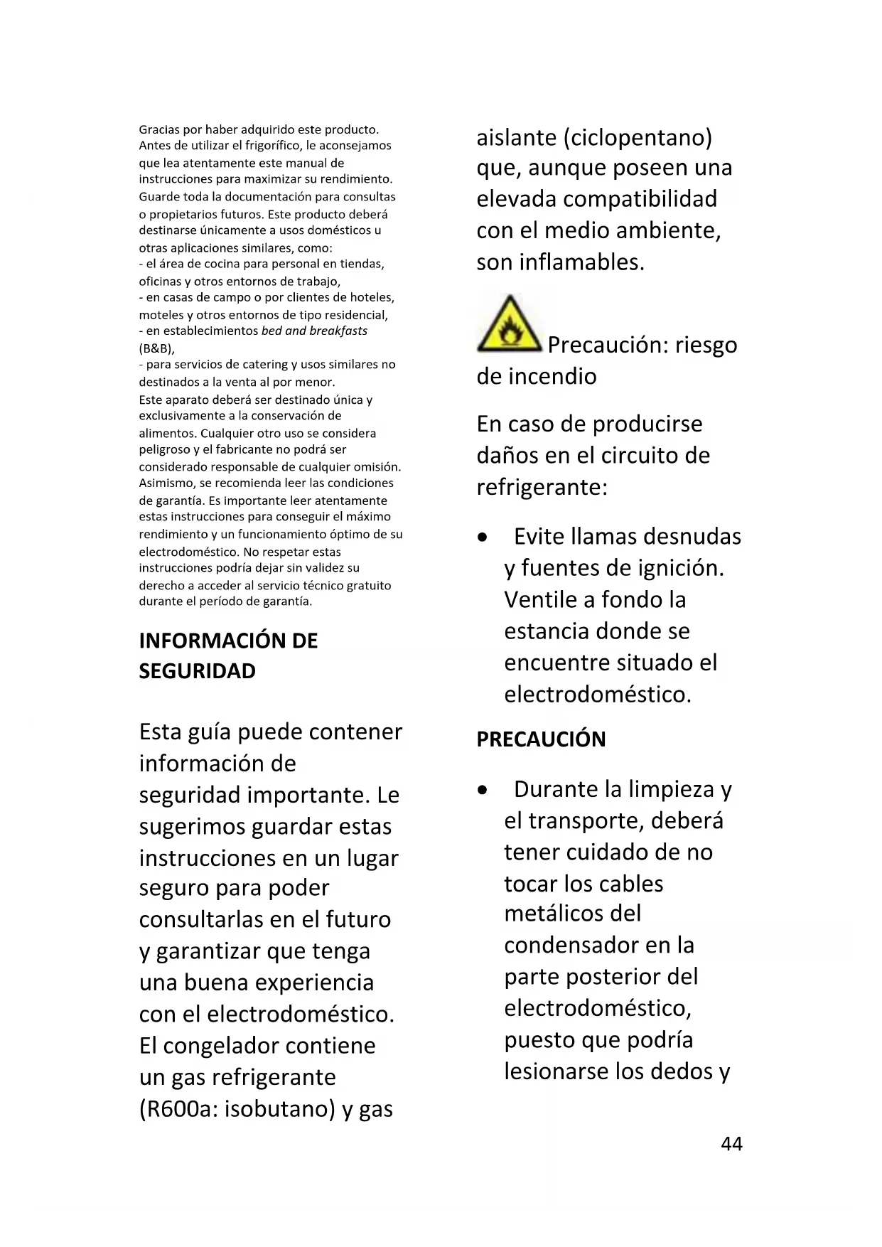 SEGURIDAD Esta guía puede contener información de seguridad importante. Le sugerimos guardar estas instrucciones en un lugar seguro para poder consultarlas en el futuro y garantizar que tenga una buena experiencia con el electrodoméstico. El congelador contiene un gas refrigerante (R600a: isobutano) y gas aislante (ciclopentano) que, aunque poseen una elevada compatibilidad con el medio ambiente, son inflamables. Precaución: riesgo de incendio En caso de producirse daños en el circuito de refrigerante: