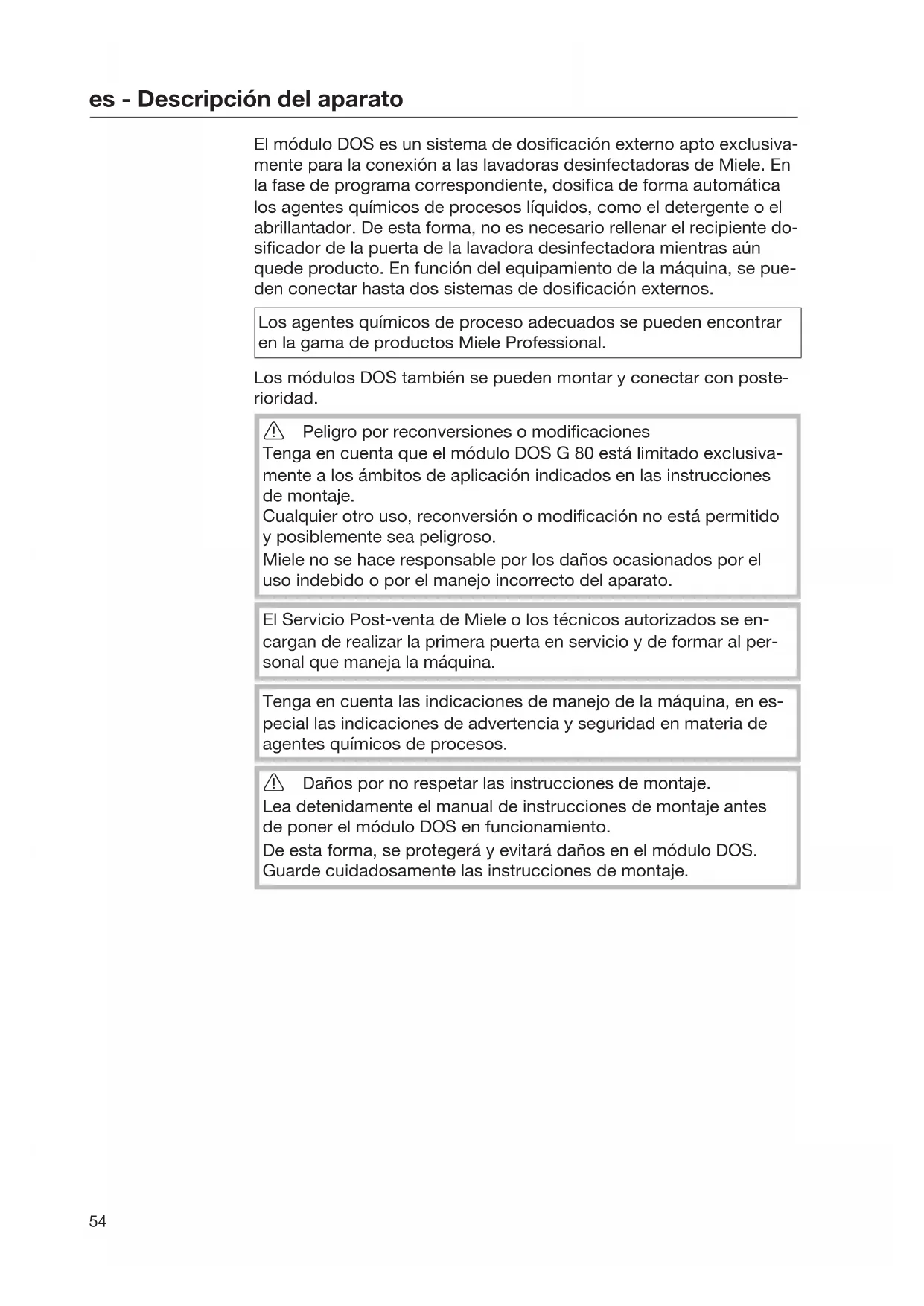 El módulo DOS es un sistema de dosificación externo apto exclusiva- mente para la conexión a las lavadoras desinfectadoras de Miele. En la fase de programa correspondiente, dosifica de forma automática los agentes químicos de procesos líquidos, como el detergente o el abrillantador. De esta forma, no es necesario rellenar el recipiente do- sificador de la puerta de la lavadora desinfectadora mientras aún quede producto. En función del equipamiento de la máquina, se pue- den conectar hasta dos sistemas de dosificación externos. Los agentes químicos de proceso adecuados se pueden encontrar en la gama de productos MieleProfessional. Los módulos DOS también se pueden montar y conectar con poste- rioridad. Peligro por reconversiones o modificaciones Tenga en cuenta que el módulo DOSG80 está limitado exclusiva- mente a los ámbitos de aplicación indicados en las instrucciones de montaje. Cualquier otro uso, reconversión o modificación no está permitido y posiblemente sea peligroso. Miele no se hace responsable por los daños ocasionados por el uso indebido o por el manejo incorrecto del aparato. El Servicio Post-venta de Miele o los técnicos autorizados se en- cargan de realizar la primera puerta en servicio y de formar al per- sonal que maneja la máquina. Tenga en cuenta las indicaciones de manejo de la máquina, en es- pecial las indicaciones de advertencia y seguridad en materia de agentes químicos de procesos. Daños por no respetar las instrucciones de montaje. Lea detenidamente el manual de instrucciones de montaje antes de poner el móduloDOS en funcionamiento. De esta forma, se protegerá y evitará daños en el móduloDOS. Guarde cuidadosamente las instrucciones de montaje.es - Descripción del aparato