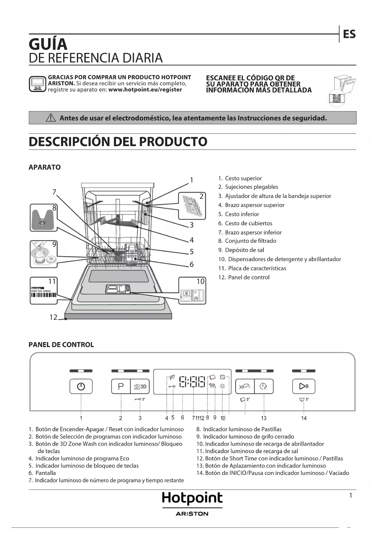 Antes de usar el electrodoméstico, lea atentamente las Instrucciones de seguridad.ESCANEE EL CÓDIGO QR DE SU APARATO PARA OBTENER INFORMACIÓN MÁS DETALLADAGRACIAS POR COMPRAR UN PRODUCTO HOTPOINT ARISTON. Si desea recibir un servicio más completo, registre su aparato en: www.hotpoint.eu/register2 PRIMER USO