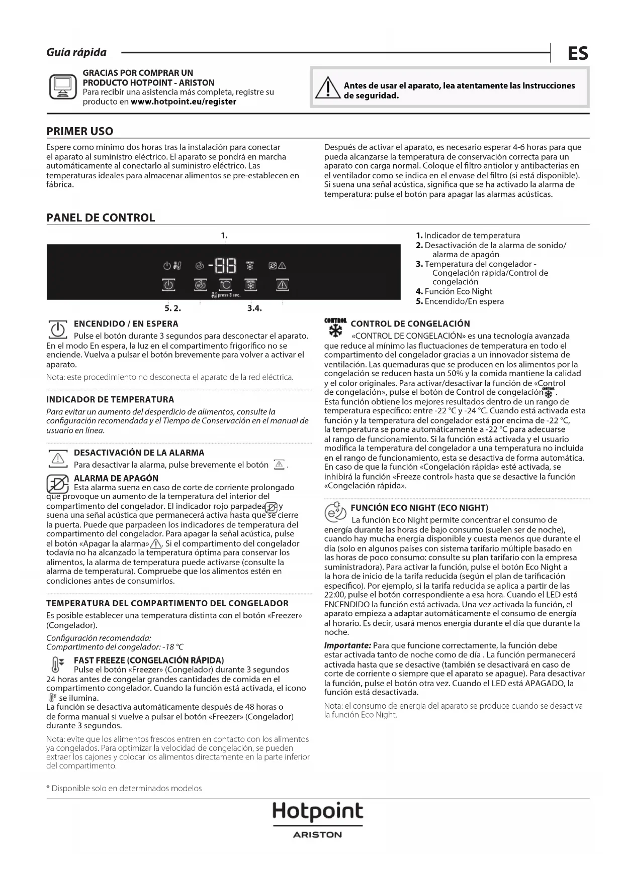 Para recibir una asistencia más completa, registre su producto en www . hotpoint . eu/ register Antes de usar el aparato, lea atentamente las Instrucciones de seguridad. PRIMER USO Espere como mínimo dos horas tras la instalación para conectar el aparato al suministro eléctrico. El aparato se pondrá en marcha automáticamente al conectarlo al suministro eléctrico. Las temperaturas ideales para almacenar alimentos se pre-establecen en fábrica. Después de activar el aparato, es necesario esperar 4-6 horas para que pueda alcanzarse la temperatura de conservación correcta para un aparato con carga normal. Coloque el ltro antiolor y antibacterias en el ventilador como se indica en el envase del ltro (si está disponible). Si suena una señal acústica, signica que se ha activado la alarma de temperatura: pulse el botón para apagar las alarmas acústicas.