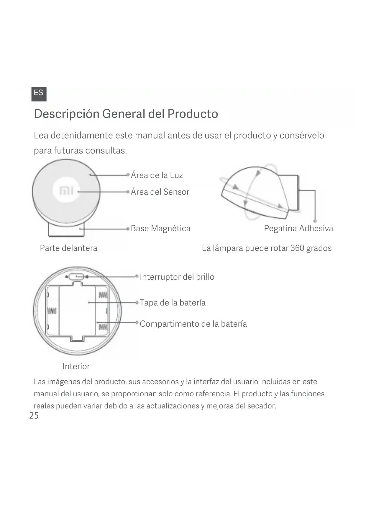 ESPrecauciones No obstruya el área de detección de la luz. Al limpiar la superficie de la luz, hágalo con una tela suave de algodón, y no utilice solventes corrosivos. No instale la luz cerca de las fuentes de calor, tales como acondicionadores de aire o ventiladores de calor, o bajo la luz directa del sol. Tampoco instale cerca de las fuentes de humedad, tales como humidificadores o cafeteras. Asegúrese de que el logo Mi esté derecho en todo momento durante la instalación y de que uso la luz nocturna. Cuando el brillo de la luz nocturna se vea reducido luego de un periodo de uso normal, el nivel de la batería será insuficiente. Remplace las baterías por otras nuevas, y descártelas de manera apropiada para evitar daños al medio ambiente. La fuente de luz contenida en esta lámpara sólo podrá ser sustituida por el fabricante, su servicio técnico o personas con una cualificación similar. Sólo para uso en interiores.