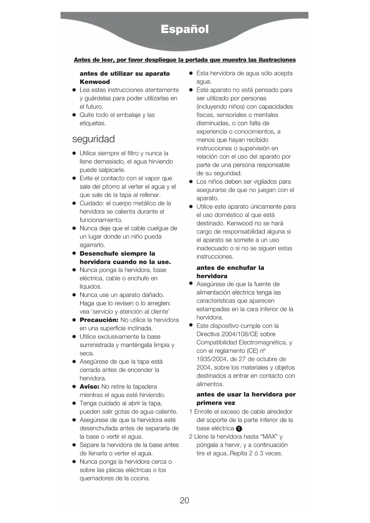 Utilice este aparato únicamente para el uso doméstico al que está destinado. Kenwood no se hará cargo de responsabilidad alguna si el aparato se somete a un uso inadecuado o si no se siguen estas instrucciones. antes de enchufar la hervidora