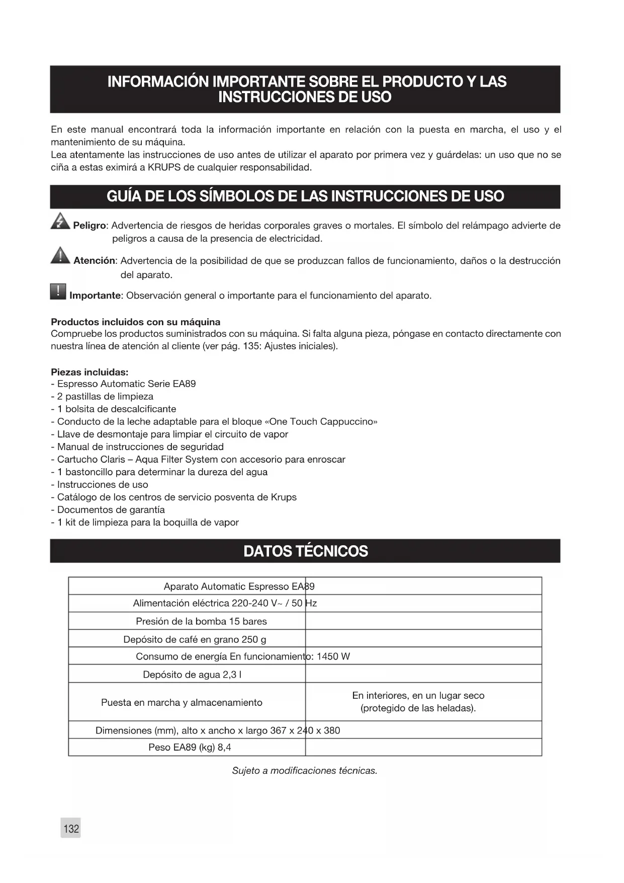 Importante: Observación general o importante para el funcionamiento del aparato. Productos incluidos con su máquina Compruebe los productos suministrados con su máquina. Si falta alguna pieza, póngase en contacto directamente con nuestra línea de atención al cliente (ver pág. 135: Ajustes iniciales). Piezas incluidas: - Espresso Automatic Serie EA89 - 2 pastillas de limpieza - 1 bolsita de descalcicante - Conducto de la leche adaptable para el bloque «One Touch Cappuccino» - Llave de desmontaje para limpiar el circuito de vapor - Manual de instrucciones de seguridad - Cartucho Claris – Aqua Filter System con accesorio para enroscar - 1 bastoncillo para determinar la dureza del agua - Instrucciones de uso - Catálogo de los centros de servicio posventa de Krups - Documentos de garantía - 1 kit de limpieza para la boquilla de vapor
