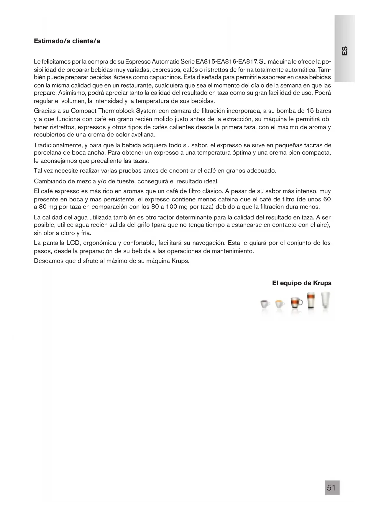 Estimado/a cliente/a Le felicitamos por la compra de su Espresso Automatic Serie EA815-EA816-EA817. Su máquina le ofrece la po- sibilidad de preparar bebidas muy variadas, expressos, cafés o ristrettos de forma totalmente automática. Tam- bién puede preparar bebidas lácteas como capuchinos. Está diseñada para permitirle saborear en casa bebidas con la misma calidad que en un restaurante, cualquiera que sea el momento del día o de la semana en que las prepare. Asimismo, podrá apreciar tanto la calidad del resultado en taza como su gran facilidad de uso. Podrá regular el volumen, la intensidad y la temperatura de sus bebidas. Gracias a su Compact Thermoblock System con cámara de filtración incorporada, a su bomba de 15 bares y a que funciona con café en grano recién molido justo antes de la extracción, su máquina le permitirá ob- tener ristrettos, expressos y otros tipos de cafés calientes desde la primera taza, con el máximo de aroma y recubiertos de una crema de color avellana. Tradicionalmente, y para que la bebida adquiera todo su sabor, el expresso se sirve en pequeñas tacitas de porcelana de boca ancha. Para obtener un expresso a una temperatura óptima y una crema bien compacta, le aconsejamos que precaliente las tazas. Tal vez necesite realizar varias pruebas antes de encontrar el café en granos adecuado. Cambiando de mezcla y/o de tueste, conseguirá el resultado ideal. El café expresso es más rico en aromas que un café de filtro clásico. A pesar de su sabor más intenso, muy presente en boca y más persistente, el expresso contiene menos cafeína que el café de filtro (de unos 60 a 80 mg por taza en comparación con los 80 a 100 mg por taza) debido a que la filtración dura menos. La calidad del agua utilizada también es otro factor determinante para la calidad del resultado en taza. A ser posible, utilice agua recién salida del grifo (para que no tenga tiempo a estancarse en contacto con el aire), sin olor a cloro y fría. La pantalla LCD, ergonómica y confortable, facilitará su navegación. Esta le guiará por el conjunto de los pasos, desde la preparación de su bebida a las operaciones de mantenimiento. Deseamos que disfrute al máximo de su máquina Krups. El equipo de Krups52 TABLA DE SIGNIFICADO DE LAS TECLAS Y BOTONES DE FUNCIÓN