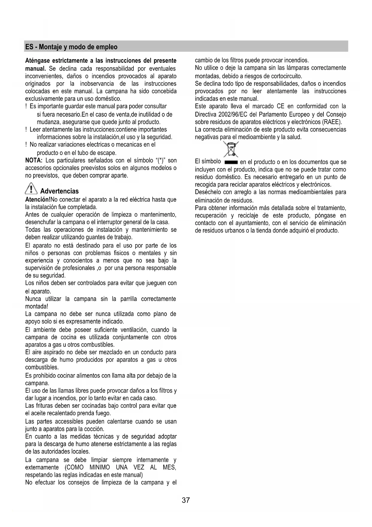 El humo y los vapores vienen reciclados en la cocina. Fig. 2 Los modelos sin motor de aspiración solamente funcionan en versión aspirante y tienen que conectarse a una unidad periférica de aspiración (no suministrada). Las instrucciones de conexión se proveen con la unidad periférica de aspiración. Instalación Fig. 3-4-5-6-7-8-9-10 La distancia mínima entre la superficie de cocción y la parte más baja de la campana no debe ser inferior a 50cm en el caso de cocinas electricas y de 65cm en el caso de cocinas a gas o mixtas. Si las instrucciones para la instalación del dispositivo para cocinar con gas especifican una distancia mayor, hay que tenerlo en consideración. Conexión eléctrica La tensión de red debe corresponder con tensión indicada en la etiqueta colocada en el interior de la campana.Si es suministrada con un enchufe, conectar la campana a un enchufe conforme a las normas en vigor y colocarlo en una zona accesible, aun después de la instalación. Si no es suministrada con enchufe (conexión directa a la red) o clavija y no es posible situarla en un lugar accesible, aun después de la instalación, colocar un interruptor bipolar de acuerdo con las normativas, para asegurarse la desconexión completa a la red en el caso de la categoria de alta tensión III, conforme con las reglas de instalación. Atención! Antes de reconectar el circuito de la campana a la red y de verificar el correcto funcionamiento, controlar siempre que el cable de red fue montado correctamente. Montaje La campana está dotada con tacos de fijación adecuados a la mayor parte de paredes/techos. De cualquier modo, conviene consultar a un técnico calificado para tener la certeza de que los materiales son adecuados a su parede/techo. La/El pared/techo debe ser lo suficientemente fuerte para sostener el peso de la campana.