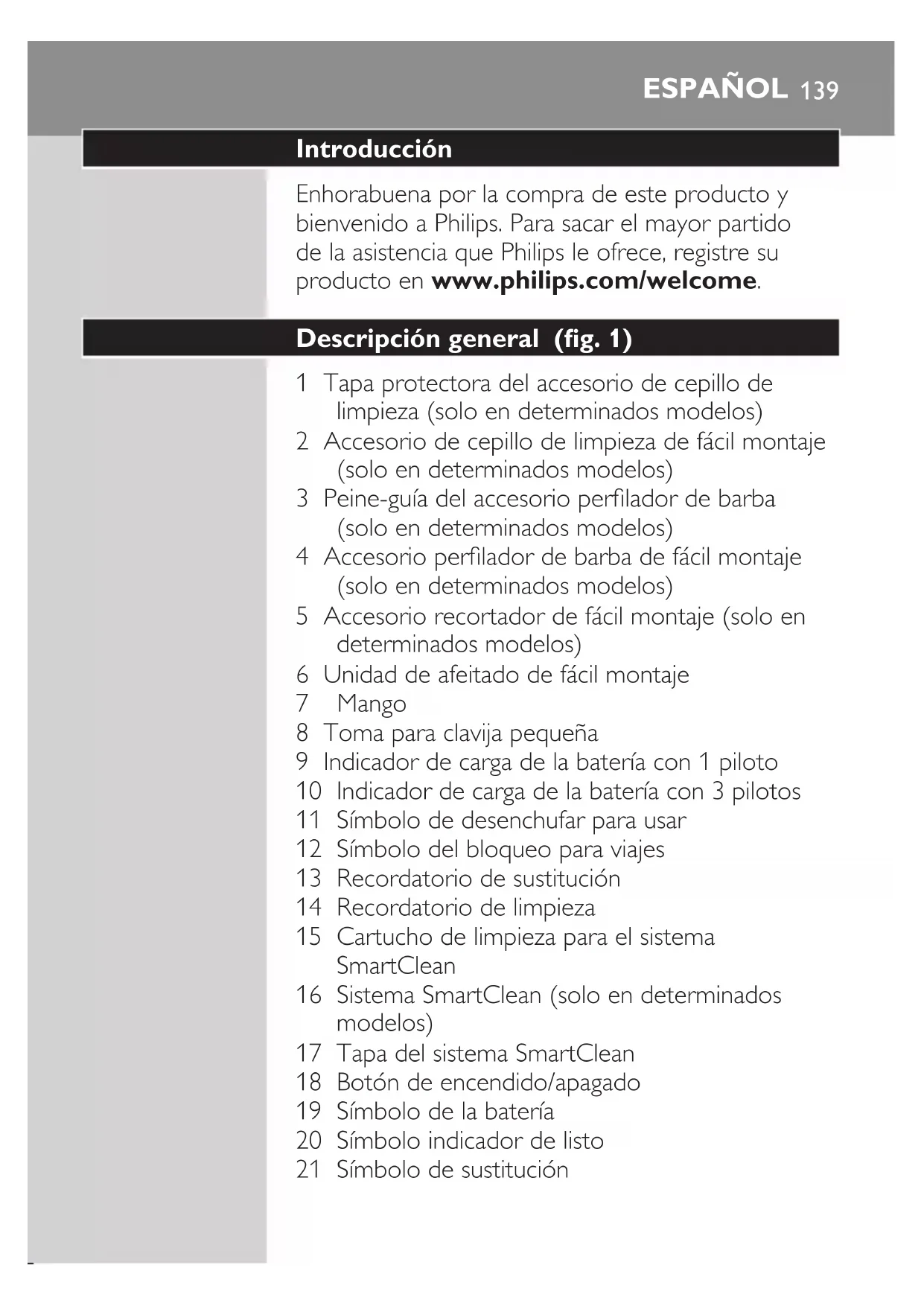 Αυτό το σύμβολο είναι μια υπενθύμιση αντικατάστασης. Αντικαταστήστε τις ξυριστικές κεφαλές (δείτε το κεφάλαιο “Αντικατάσταση”). ΕΛΛΗΝΙΚΑ138139 Introducción Enhorabuena por la compra de este producto y bienvenido a Philips. Para sacar el mayor partido de la asistencia que Philips le ofrece, registre su producto en www.philips.com/welcome. Descripción general (g. 1) 1 Tapa protectora del accesorio de cepillo de limpieza (solo en determinados modelos) 2 Accesorio de cepillo de limpieza de fácil montaje (solo en determinados modelos) 3 Peine-guía del accesorio perlador de barba (solo en determinados modelos) 4 Accesorio perlador de barba de fácil montaje (solo en determinados modelos) 5 Accesorio recortador de fácil montaje (solo en determinados modelos) 6 Unidad de afeitado de fácil montaje 7 Mango 8 Toma para clavija pequeña 9 Indicador de carga de la batería con 1 piloto 10 Indicador de carga de la batería con 3 pilotos 11 Símbolo de desenchufar para usar 12 Símbolo del bloqueo para viajes 13 Recordatorio de sustitución 14 Recordatorio de limpieza 15 Cartucho de limpieza para el sistema SmartClean 16 Sistema SmartClean (solo en determinados modelos) 17 Tapa del sistema SmartClean 18 Botón de encendido/apagado 19 Símbolo de la batería 20 Símbolo indicador de listo 21 Símbolo de sustitución ESPAÑOL22 Símbolo de limpieza 23 Adaptador de corriente 24 Clavija pequeña 25 Funda Nota: Los accesorios suministrados pueden variar según el producto. La caja muestra los accesorios que se han suministrado con el aparato. Información de seguridad importante Antes de usar el aparato, lea atentamente esta información importante y consérvela por si necesitara consultarla en el futuro. Los accesorios suministrados pueden variar según el producto. Peligro - Mantenga el adaptador seco. Advertencia - El adaptador incorpora un transformador. No corte el adaptador para sustituirlo por otra clavija, ya que podría provocar situaciones de peligro. - Este aparato puede ser usado por niños a partir de 8 años y por personas con su capacidad física, psíquica o sensorial reducida y por quienes no tengan los conocimientos y la experiencia necesarios, si han sido supervisados o instruidos acerca del uso del aparato de forma segura y siempre que sepan los riesgos que conlleva su uso. No permita que los niños jueguen con el aparato. Los niños no deben llevar a cabo la limpieza ni el mantenimiento a menos que sean supervisados. - Desenchufe siempre la afeitadora antes de limpiarla bajo el grifo. - Compruebe siempre el aparato antes de utilizarlo. No utilice el aparato si está dañado, ya que podría ocasionar lesiones. Sustituya siempre una pieza dañada por una del modelo original. ESPAÑOL140Precaución - No sumerja nunca el sistema de limpieza ni el soporte de carga en agua ni los enjuague bajo el grifo. - No utilice nunca agua a una temperatura superior a 80 °C para enjuagar la afeitadora. - Utilice este aparato solo para el uso al que está destinado como se indica en el manual de usuario. - Por razones de higiene, el aparato debería ser usado únicamente por una persona. - No utilice nunca aire comprimido, estropajos, agentes abrasivos ni líquidos agresivos, como gasolina o acetona, para limpiar el aparato. - Si la afeitadora está equipada con un sistema de limpieza, utilice siempre el líquido limpiador original de Philips (cartucho o botella, dependiendo del tipo de sistema de limpieza). - Coloque siempre el sistema de limpieza sobre una supercie horizontal, plana y estable para evitar que el líquido se derrame. - Si el sistema de limpieza utiliza un cartucho de limpieza, asegúrese siempre de que el compartimento del cartucho está cerrado antes de utilizar el sistema de limpieza para limpiar o cargar la afeitadora. - Cuando el sistema de limpieza esté listo parar usar, no lo mueva para evitar que el líquido limpiador se derrame. - No enchufe el adaptador a tomas de corriente eléctrica que tengan un ambientador conectado o que lo hayan tenido para evitar daños irreparables en el adaptador. ESPAÑOL 141- Cuando enjuague la afeitadora es posible que salga agua por el oricio de su parte inferior. Esto es normal y no es peligroso, ya que todos los sistemas electrónicos están dentro de una unidad motora hermética en el interior de la afeitadora. Campos electromagnéticos (CEM) - Este aparato de Philips cumple los estándares y las normativas aplicables sobre exposición a campos electromagnéticos. General - Esta afeitadora es resistente al agua. Se puede utilizar en la bañera o en la ducha y se puede limpiar bajo el grifo. Por tanto, la afeitadora solo puede utilizarse sin cable por motivos de seguridad. - Este aparato es adecuado para voltajes de red de 100 a 240 voltios. - El adaptador transforma la corriente de