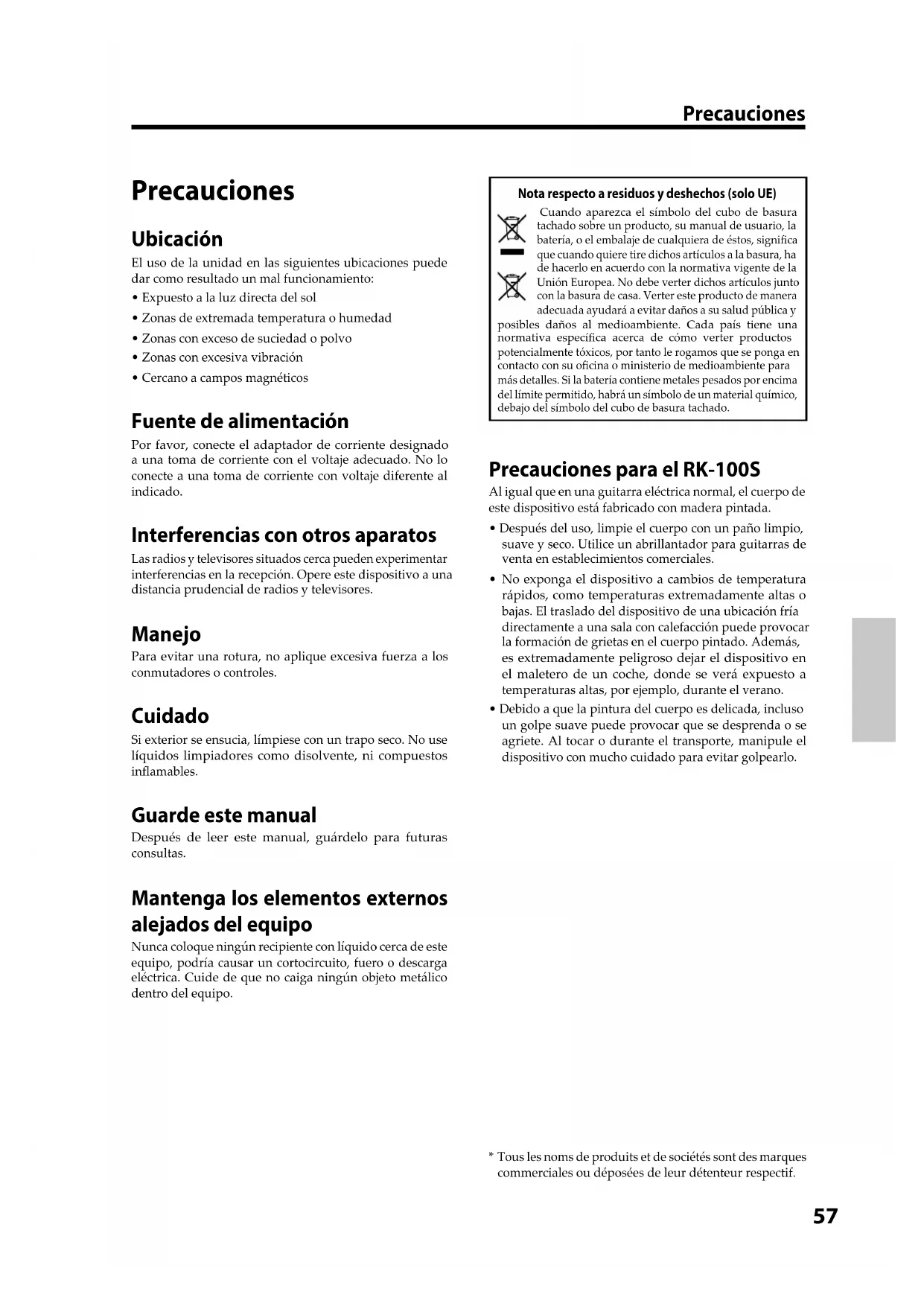 - Cercano a campos magnéticos Fuente de alimentación Por favor, conecte el adaptador de corriente designado a una toma de corriente con el voltaje adecuado. No lo conecte a una toma de corriente con voltaje diferente al indicado. Interferencias con otros aparatos Las radios y televisores situados cerca pueden experimentar interferencias en la recepción. Opere este dispositivo a una distancia prudencial de radios y televisores. Manejo Para evitar una rotura, no aplique excesiva fuerza a los conmutadores o controles. Cuidado Si exterior se ensucia, límpiese con un trapo seco. No use líquidos limpiadores como disolvente, ni compuestos inamables. Guarde este manual Después de leer este manual, guárdelo para futuras consultas. Mantenga los elementos externos alejados del equipo Nunca coloque ningún recipiente con líquido cerca de este equipo, podría causar un cortocircuito, fuero o descarga eléctrica. Cuide de que no caiga ningún objeto metálico dentro del equipo. Nota respecto a residuos y deshechos (solo UE) Cuando aparezca el símbolo del cubo de basura tachado sobre un producto, su manual de usuario, la batería, o el embalaje de cualquiera de éstos, signica que cuando quiere tire dichos artículos a la basura, ha de hacerlo en acuerdo con la normativa vigente de la Unión Europea. No debe verter dichos artículos junto con la basura de casa. Verter este producto de manera adecuada ayudará a evitar daños a su salud pública y posibles daños al medioambiente. Cada país tiene una normativa especíca acerca de cómo verter productos potencialmente tóxicos, por tanto le rogamos que se ponga en contacto con su ocina o ministerio de medioambiente para más detalles. Si la batería contiene metales pesados por encima del límite permitido, habrá un símbolo de un material químico, debajo del símbolo del cubo de basura tachado. Precauciones para el RK-100S Al igual que en una guitarra eléctrica normal, el cuerpo de este dispositivo está fabricado con madera pintada.