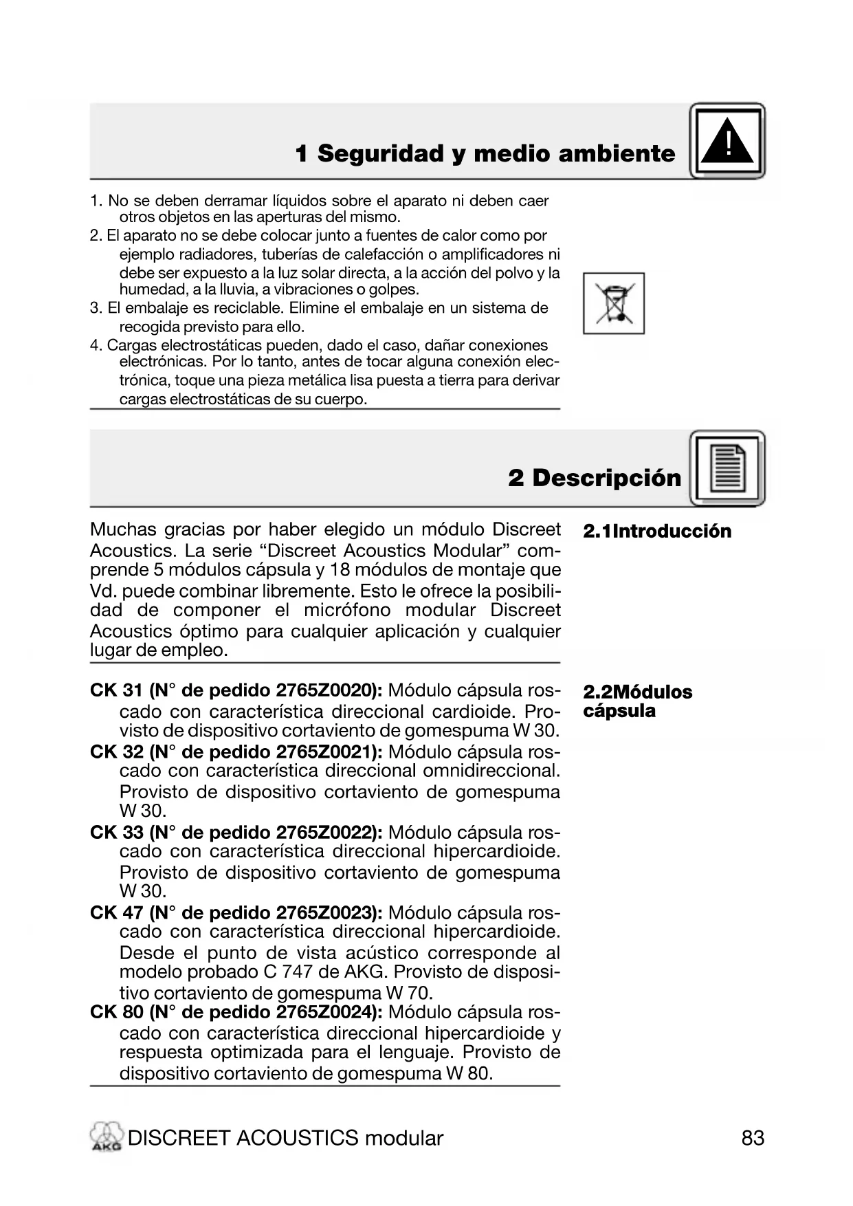 cápsula Muchas gracias por haber elegido un módulo Discreet Acoustics. La serie “Discreet Acoustics Modular” com- prende 5 módulos cápsula y 18 módulos de montaje que Vd. puede combinar libremente. Esto le ofrece la posibili- dad de componer el micrófono modular Discreet Acoustics óptimo para cualquier aplicación y cualquier lugar de empleo. CK 31 (N° de pedido 2765Z0020): Módulo cápsula ros- cado con característica direccional cardioide. Pro- visto de dispositivo cortaviento de gomespuma W 30. CK 32 (N° de pedido 2765Z0021): Módulo cápsula ros- cado con característica direccional omnidireccional. Provisto de dispositivo cortaviento de gomespuma W 30. CK 33 (N° de pedido 2765Z0022): Módulo cápsula ros- cado con característica direccional hipercardioide. Provisto de dispositivo cortaviento de gomespuma W 30. CK 47 (N° de pedido 2765Z0023): Módulo cápsula ros- cado con característica direccional hipercardioide. Desde el punto de vista acústico corresponde al modelo probado C 747 de AKG. Provisto de disposi- tivo cortaviento de gomespuma W 70. CK 80 (N° de pedido 2765Z0024): Módulo cápsula ros- cado con característica direccional hipercardioide y respuesta optimizada para el lenguaje. Provisto de dispositivo cortaviento de gomespuma W 80. DISCREET ACOUSTICS modular 1 Seguridad y medio ambiente 1. No se deben derramar líquidos sobre el aparato ni deben caerotros objetos en las aperturas del mismo.2. El aparato no se debe colocar junto a fuentes de calor como porejemplo radiadores, tuberías de calefacción o amplificadores nidebe ser expuesto a la luz solar directa, a la acción del polvo y lahumedad, a la lluvia, a vibraciones o golpes.3. El embalaje es reciclable. Elimine el embalaje en un sistema derecogida previsto para ello.4. Cargas electrostáticas pueden, dado el caso, dañar conexioneselectrónicas. Por lo tanto, antes de tocar alguna conexión elec-trónica, toque una pieza metálica lisa puesta a tierra para derivarcargas electrostáticas de su cuerpo. 2 Descripción