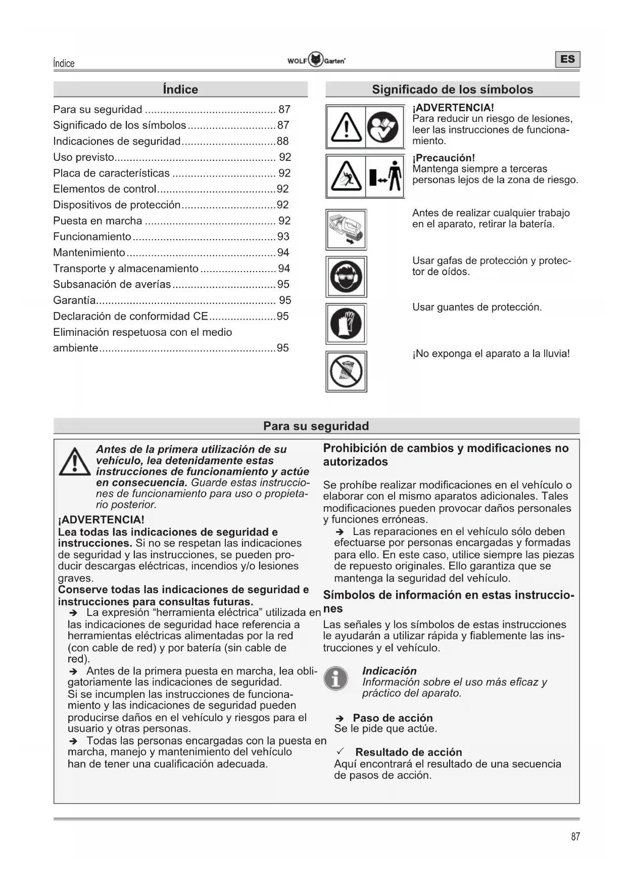 - Antes de la primera utilización de su vehículo, lea detenidamente estas instrucciones de funcionamiento y actúe en consecuencia. Guarde estas instruccio- nes de funcionamiento para uso o propieta- rio posterior. ¡ADVERTENCIA! Lea todas las indicaciones de seguridad e instrucciones. Si no se respetan las indicaciones de seguridad y las instrucciones, se pueden pro- ducir descargas eléctricas, incendios y/o lesiones graves. Conserve todas las indicaciones de seguridad e instrucciones para consultas futuras. Î La expresión “herramienta eléctrica” utilizada en las indicaciones de seguridad hace referencia a herramientas eléctricas alimentadas por la red (con cable de red) y por batería (sin cable de red). Î Antes de la primera puesta en marcha, lea obli- gatoriamente las indicaciones de seguridad. Si se incumplen las instrucciones de funciona- miento y las indicaciones de seguridad pueden producirse daños en el vehículo y riesgos para el usuario y otras personas. Î Todas las personas encargadas con la puesta en marcha, manejo y mantenimiento del vehículo han de tener una cualicación adecuada. Prohibición de cambios y modificaciones no autorizados Se prohíbe realizar modicaciones en el vehículo o elaborar con el mismo aparatos adicionales. Tales modicaciones pueden provocar daños personales y funciones erróneas. Î Las reparaciones en el vehículo sólo deben efectuarse por personas encargadas y formadas para ello. En este caso, utilice siempre las piezas de repuesto originales. Ello garantiza que se mantenga la seguridad del vehículo. Símbolos de información en estas instruccio- nes Las señales y los símbolos de estas instrucciones le ayudarán a utilizar rápida y ablemente las ins- trucciones y el vehículo. Indicación Información sobre el uso más ecaz y práctico del aparato. Î Paso de acción Se le pide que actúe. 3 Resultado de acción Aquí encontrará el resultado de una secuencia de pasos de acción. Índice Para su seguridad p. 87
