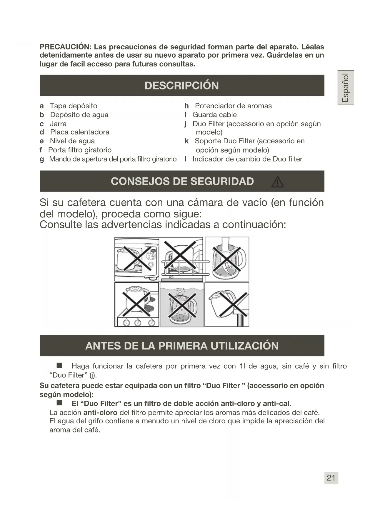 Haga funcionar la cafetera por primera vez con 1l de agua, sin café y sin ltro “DuoFilter” (j). Su cafetera puede estar equipada con un ltro “Duo Filter ” (accessorio en opción según modelo): El “Duo Filter” es un ltro de doble acción anti-cloro y anti-cal. La acción anti-cloro del ltro permite apreciar los aromas más delicados del café. El agua del grifo contiene a menudo un nivel de cloro que impide la apreciación del aroma del café. PRECAUCIÓN: Las precauciones de seguridad forman parte del aparato. Léalas detenidamente antes de usar su nuevo aparato por primera vez. Guárdelas en un lugar de facil acceso para futuras consultas.22