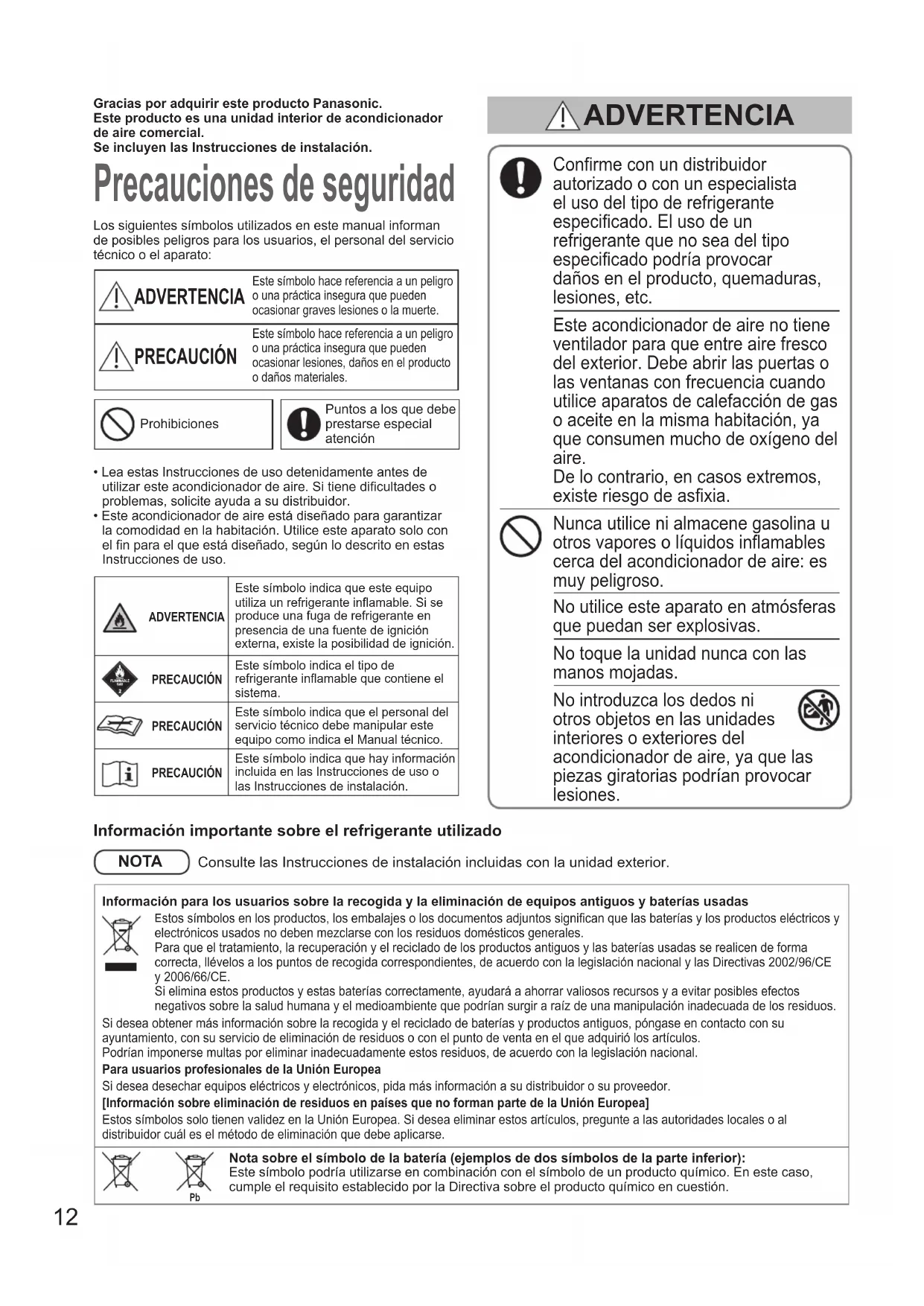 00_330596_all.indb 11 2021/4/14 13:07:0012 Gracias por adquirir este producto Panasonic.Este producto es una unidad interior de acondicionador de aire comercial.Se incluyen las Instrucciones de instalación. Precauciones de seguridad Los siguientes símbolos utilizados en este manual informan de posibles peligros para los usuarios, el personal del servicio técnico o el aparato: ADVERTENCIA Este símbolo hace referencia a un peligro o una práctica insegura que pueden ocasionar graves lesiones o la muerte. PRECAUCIÓN Este símbolo hace referencia a un peligro o una práctica insegura que pueden ocasionar lesiones, daños en el producto o daños materiales.ProhibicionesPuntos a los que debe prestarse especial atención• Lea estas Instrucciones de uso detenidamente antes de utilizar este acondicionador de aire. Si tiene dicultades o problemas, solicite ayuda a su distribuidor.• Este acondicionador de aire está diseñado para garantizar la comodidad en la habitación. Utilice este aparato solo con el n para el que está diseñado, según lo descrito en estas Instrucciones de uso. Conrme con un distribuidor autorizado o con un especialista el uso del tipo de refrigerante especicado. El uso de un refrigerante que no sea del tipo especicado podría provocar daños en el producto, quemaduras, lesiones, etc. Este acondicionador de aire no tiene ventilador para que entre aire fresco del exterior. Debe abrir las puertas o las ventanas con frecuencia cuando utilice aparatos de calefacción de gas o aceite en la misma habitación, ya que consumen mucho de oxígeno del aire. De lo contrario, en casos extremos, existe riesgo de asxia. Nunca utilice ni almacene gasolina u otros vapores o líquidos inamables cerca del acondicionador de aire: es muy peligroso. No utilice este aparato en atmósferas que puedan ser explosivas. No toque la unidad nunca con las manos mojadas. No introduzca los dedos ni otros objetos en las unidades interiores o exteriores del acondicionador de aire, ya que las piezas giratorias podrían provocar lesiones. ADVERTENCIA ADVERTENCIAEste símbolo indica que este equipo utiliza un refrigerante inflamable. Si se produce una fuga de refrigerante en presencia de una fuente de ignición externa, existe la posibilidad de ignición.PRECAUCIÓNEste símbolo indica el tipo de refrigerante inflamable que contiene el sistema.PRECAUCIÓNEste símbolo indica que el personal del servicio técnico debe manipular este equipo como indica el Manual técnico.PRECAUCIÓNEste símbolo indica que hay información incluida en las Instrucciones de uso o las Instrucciones de instalación.Información importante sobre el refrigerante utilizado NOTA Consulte las Instrucciones de instalación incluidas con la unidad exterior.Información para los usuarios sobre la recogida y la eliminación de equipos antiguos y baterías usadas