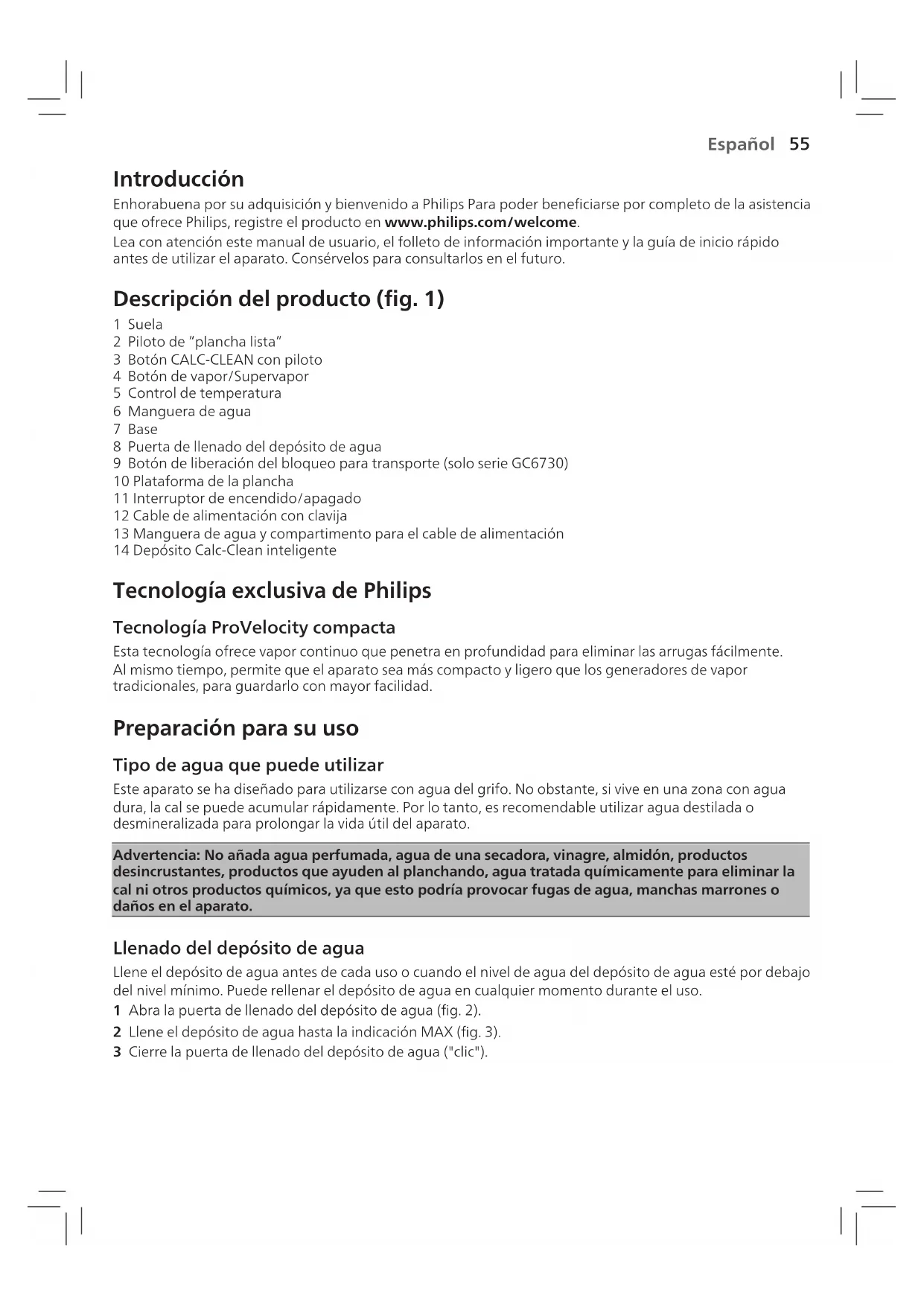1 Suela 2 Piloto de “plancha lista” 3 Botón CALC-CLEAN con piloto 4 Botón de vapor/Supervapor 5 Control de temperatura 6 Manguera de agua 7 Base 8 Puerta de llenado del depósito de agua 9 Botón de liberación del bloqueo para transporte )solo serie GC6730( 10 Plataforma de la plancha 11 Interruptor de encendido/apagado 12 Cable de alimentación con clavija 13 Manguera de agua y compartimento para el cable de alimentación 14 Depósito Calc-Clean inteligente Tecnología exclusiva de Philips Tecnología ProVelocity compacta Esta tecnología ofrece vapor continuo que penetra en profundidad para eliminar las arrugas fácilmente. Al mismo tiempo, permite que el aparato sea más compacto y ligero que los generadores de vapor tradicionales, para guardarlo con mayor facilidad. Preparación para su uso Tipo de agua que puede utilizar Este aparato se ha diseñado para utilizarse con agua del grifo. No obstante, si vive en una zona con agua dura, la cal se puede acumular rápidamente. Por lo tanto, es recomendable utilizar agua destilada o desmineralizada para prolongar la vida útil del aparato. Advertencia: No añada agua perfumada, agua de una secadora, vinagre, almidón, productos