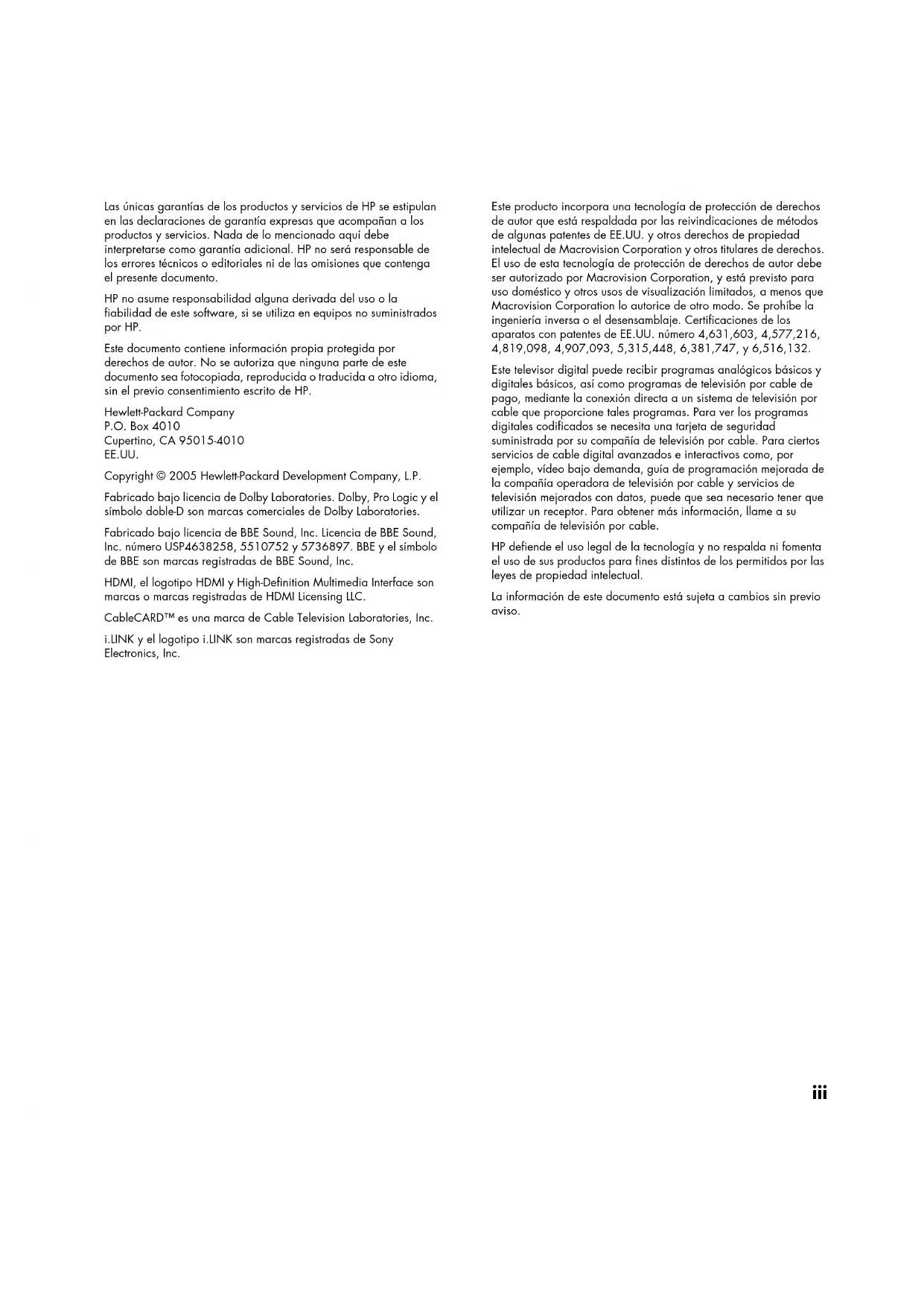 À titre de précaution, notez votre numéro secret ci-dessous, découpez le coupon et conservez-le en lieu sûr.— Lea esto — Guía del usuario del televisor LCD de alta definición HP Pavilion Televisor LCD de alta definición HP Pavilion LC3700N de 37 pulgadas (94 cm) Televisor LCD de alta definición HP Pavilion LC3200N de 32 pulgadas (81 cm) Televisor LCD de alta definición HP Pavilion LC2600N de 26 pulgadas (66 cm)iii Las únicas garantías de los productos y servicios de HP se estipulan en las declaraciones de garantía expresas que acompañan a los productos y servicios. Nada de lo mencionado aquí debe interpretarse como garantía adicional. HP no será responsable de los errores técnicos o editoriales ni de las omisiones que contenga el presente documento. HP no asume responsabilidad alguna derivada del uso o la fiabilidad de este software, si se utiliza en equipos no suministrados por HP. Este documento contiene información propia protegida por derechos de autor. No se autoriza que ninguna parte de este documento sea fotocopiada, reproducida o traducida a otro idioma, sin el previo consentimiento escrito de HP. Hewlett-Packard Company P.O. Box 4010 Cupertino, CA 95015-4010 EE.UU. Copyright © 2005 Hewlett-Packard Development Company, L.P. Fabricado bajo licencia de Dolby Laboratories. Dolby, Pro Logic y el símbolo doble-D son marcas comerciales de Dolby Laboratories. Fabricado bajo licencia de BBE Sound, Inc. Licencia de BBE Sound, Inc. número USP4638258, 5510752 y 5736897. BBE y el símbolo de BBE son marcas registradas de BBE Sound, Inc. HDMI, el logotipo HDMI y High-Definition Multimedia Interface son marcas o marcas registradas de HDMI Licensing LLC. CableCARD™ es una marca de Cable Television Laboratories, Inc. i.LINK y el logotipo i.LINK son marcas registradas de Sony Electronics, Inc. Este producto incorpora una tecnología de protección de derechos de autor que está respaldada por las reivindicaciones de métodos de algunas patentes de EE.UU. y otros derechos de propiedad intelectual de Macrovision Corporation y otros titulares de derechos. El uso de esta tecnología de protección de derechos de autor debe ser autorizado por Macrovision Corporation, y está previsto para uso doméstico y otros usos de visualización limitados, a menos que Macrovision Corporation lo autorice de otro modo. Se prohíbe la ingeniería inversa o el desensamblaje. Certificaciones de los aparatos con patentes de EE.UU. número 4,631,603, 4,577,216, 4,819,098, 4,907,093, 5,315,448, 6,381,747, y 6,516,132. Este televisor digital puede recibir programas analógicos básicos y digitales básicos, así como programas de televisión por cable de pago, mediante la conexión directa a un sistema de televisión por cable que proporcione tales programas. Para ver los programas digitales codificados se necesita una tarjeta de seguridad suministrada por su compañía de televisión por cable. Para ciertos servicios de cable digital avanzados e interactivos como, por ejemplo, vídeo bajo demanda, guía de programación mejorada de la compañía operadora de televisión por cable y servicios de televisión mejorados con datos, puede que sea necesario tener que utilizar un receptor. Para obtener más información, llame a su compañía de televisión por cable. HP defiende el uso legal de la tecnología y no respalda ni fomenta el uso de sus productos para fines distintos de los permitidos por las leyes de propiedad intelectual. La información de este documento está sujeta a cambios sin previo aviso.iv Guía del usuario del televisor LCD de alta definición HP Pavilion