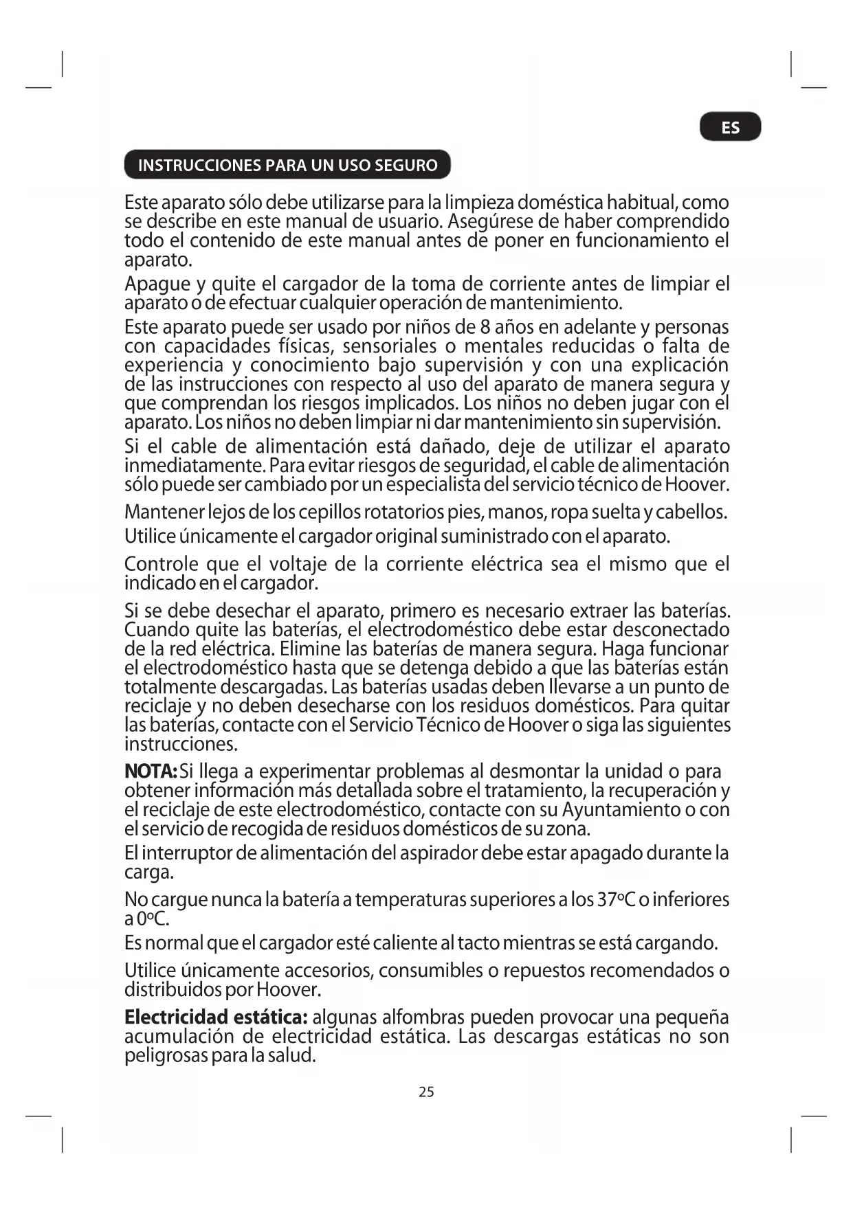- Sólo para algunos modelos eS28 RESOlUCIóN DE PROblEMAS Si tiene algún problema con su aspirador, siga esta simple lista de verificación antes de llamar al servicio técnico de Hoover: A. Elaspiradornoseenciende. Verifique si el aspirador está cargado. B. Pérdidadeaspiraciónosinaspiración. Vacíe el contenedor de polvo y lave el filtro. Extraiga la tobera y controle si hay obstrucciones en el conducto. C. Lasbateríasnosepuedencargar. Este puede ser el resultado de periodos de almacenamiento muy prolongados (más de 6 meses). Contacte con el servício técnico de Hoover para acordar un reemplazo de baterías. Si el problema continúa, contacte con el servício técnico de Hoover.