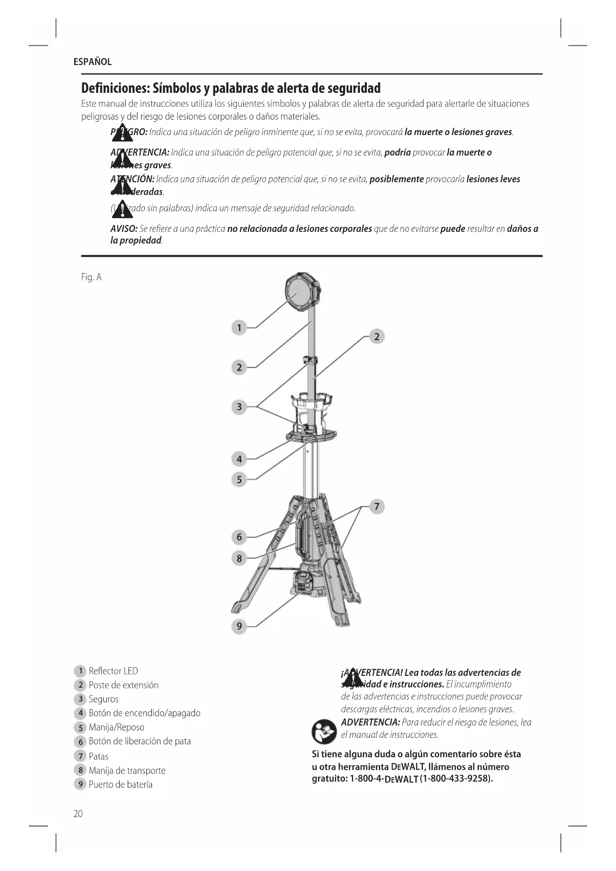 ¡ADVERTENCIA! Lea todas las advertencias de seguridad e instrucciones. El incumplimiento de las advertencias e instrucciones puede provocar descargas eléctricas, incendios o lesionesgraves. ADVERTENCIA: Para reducir el riesgo de lesiones, lea el manual deinstrucciones. Si tiene alguna duda o algún comentario sobre ésta u otra herramienta DeWALT , llámenos al número gratuito: 1-800-4- DeWALT (1-800-433-9258). Definiciones: Símbolos y palabras de alerta de seguridad Este manual de instrucciones utiliza los siguientes símbolos y palabras de alerta de seguridad para alertarle de situaciones peligrosas y del riesgo de lesiones corporales o daños materiales.