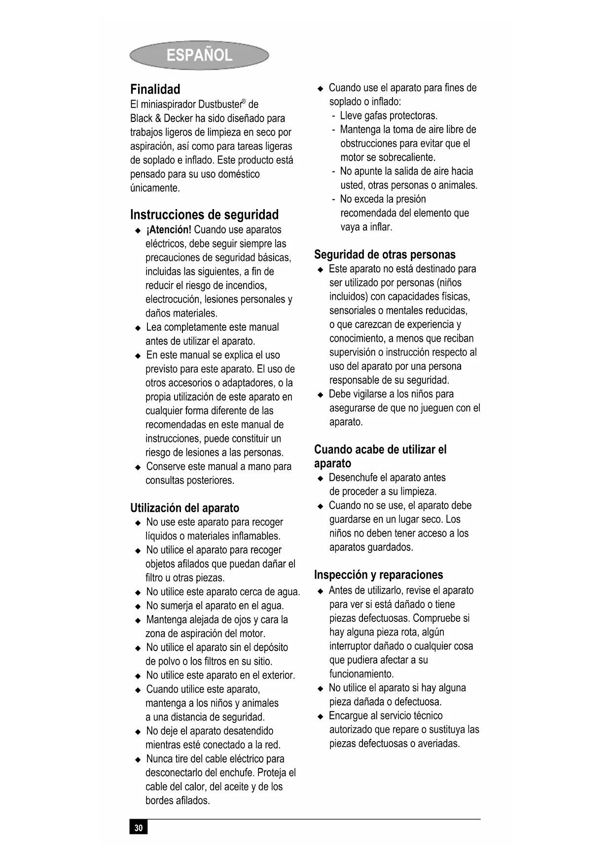 Black & Decker ha sido diseñado para trabajos ligeros de limpieza en seco por aspiración, así como para tareas ligeras de soplado e inflado. Este producto está pensado para su uso doméstico únicamente. Instrucciones de seguridad ¡Atención! Cuando use aparatos eléctricos, debe seguir siempre las precauciones de seguridad básicas, incluidas las siguientes, a fin de reducir el riesgo de incendios, electrocución, lesiones personales y daños materiales. Lea completamente este manual antes de utilizar el aparato. En este manual se explica el uso previsto para este aparato. El uso de otros accesorios o adaptadores, o la propia utilización de este aparato en cualquier forma diferente de las recomendadas en este manual de instrucciones, puede constituir un riesgo de lesiones a las personas. Conserve este manual a mano para consultas posteriores. Utilización del aparato No use este aparato para recoger líquidos o materiales inflamables. No utilice el aparato para recoger objetos afilados que puedan dañar el filtro u otras piezas. No utilice este aparato cerca de agua. No sumerja el aparato en el agua. Mantenga alejada de ojos y cara la zona de aspiración del motor. No utilice el aparato sin el depósito de polvo o los filtros en su sitio. No utilice este aparato en el exterior. Cuando utilice este aparato, mantenga a los niños y animales a una distancia de seguridad. No deje el aparato desatendido mientras esté conectado a la red. Nunca tire del cable eléctrico para desconectarlo del enchufe. Proteja el cable del calor, del aceite y de los bordes afilados. Cuando use el aparato para fines de soplado o inflado: - Lleve gafas protectoras. - Mantenga la toma de aire libre de obstrucciones para evitar que el motor se sobrecaliente. - No apunte la salida de aire hacia usted, otras personas o animales. - No exceda la presión recomendada del elemento que vaya a inflar. Seguridad de otras personas Este aparato no está destinado para ser utilizado por personas (niños incluidos) con capacidades físicas, sensoriales o mentales reducidas, o que carezcan de experiencia y conocimiento, a menos que reciban supervisión o instrucción respecto al uso del aparato por una persona responsable de su seguridad. Debe vigilarse a los niños para asegurarse de que no jueguen con el aparato. Cuando acabe de utilizar el aparato Desenchufe el aparato antes de proceder a su limpieza. Cuando no se use, el aparato debe guardarse en un lugar seco. Los niños no deben tener acceso a los aparatos guardados. Inspección y reparaciones Antes de utilizarlo, revise el aparato para ver si está dañado o tiene piezas defectuosas. Compruebe si hay alguna pieza rota, algún interruptor dañado o cualquier cosa que pudiera afectar a su funcionamiento. No utilice el aparato si hay alguna pieza dañada o defectuosa. Encargue al servicio técnico autorizado que repare o sustituya las piezas defectuosas o averiadas.31 ESPAÑOL Compruebe periódicamente el estado del cable eléctrico. Si el cable eléctrico está estropeado, debe ser sustituido por el fabricante o un servicio técnico autorizado de Black & Decker con el fin de evitar accidentes. No intente nunca extraer o sustituir ninguna de las piezas que no sean las especificadas en este manual. Seguridad eléctrica
