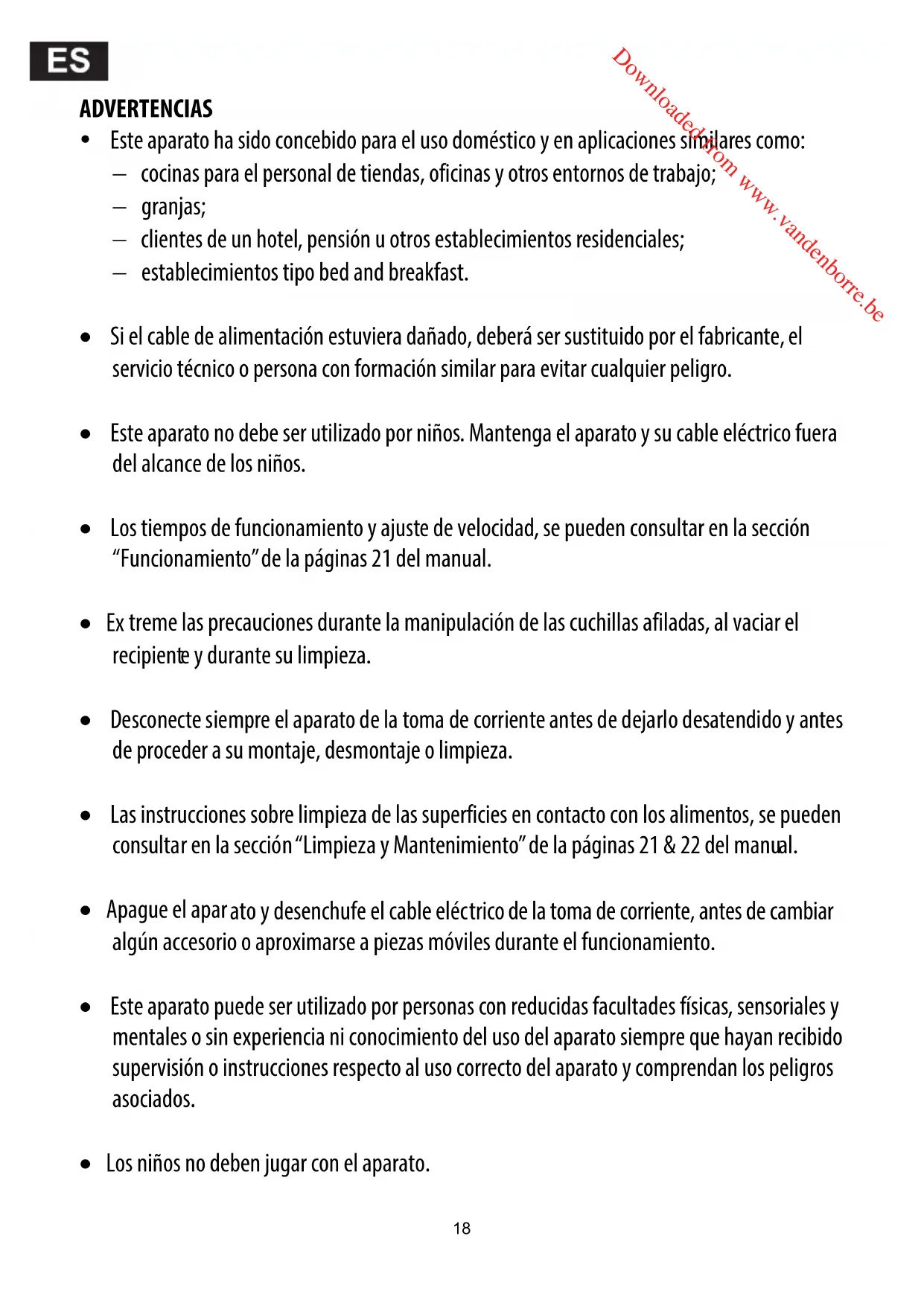 Downloaded from www.vandenborre.beADVERTENCIAS Este aparato ha sido concebido para el uso doméstico y en aplicaciones similares como: cocinas para el personal de tiendas, oficinas y otros entornos de trabajo; granjas; clientes de un hotel, pensión u otros establecimientos residenciales; establecimientos tipo bed and breakfast. Si el cable de alimentación estuviera dañado, deberá ser sustituido por el fabricante, el servicio técnico o persona con formación similar para evitar cualquier peligro. Este aparato no debe ser utilizado por niños. Mantenga el aparato y su cable eléctrico fuera del alcance de los niños. Los tiempos de funcionamiento y ajuste de velocidad, se pueden consultar en la sección “Funcionamiento” de la páginas 21 del manual.