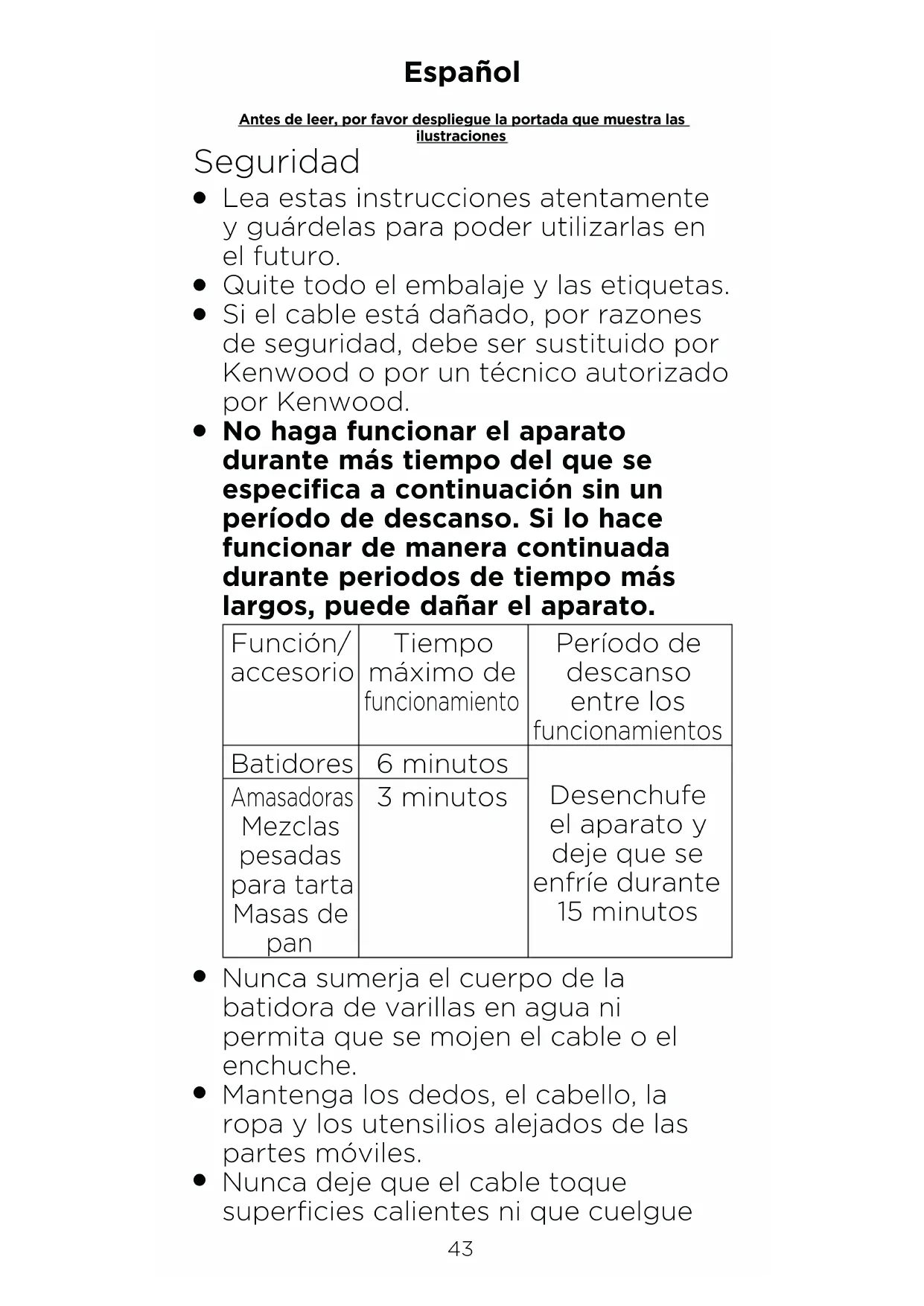 Utilice este aparato únicamente para el uso doméstico al que está destinado. Kenwood no se hará cargo de responsabilidad alguna si el aparato se somete a un uso inadecuado o si no se siguen estas instrucciones.45 Antes de utilizar la batidora de varillas de mano por primera vez