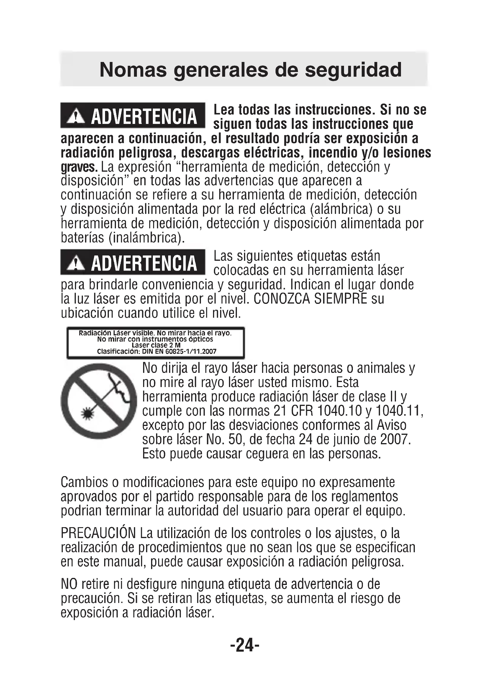 ADVERTENCIA Radiación Láser visible. No mirar hacia el rayo. No mirar con instrumentos ópticos Laser clase 2 M Clasificación: DIN EN 60825-1/11.2007-25- La utilización de controles o ajustes, o la realización de procedimientos que no sean los especificados en este manual, puede causar exposición a radiación peligrosa. Asegúrese SIEMPRE de que todas las personas que se encuentren en la vecindad del lugar de uso conozcan los peligros de mirar directamente al láser. NO coloque la herramienta en una posición que pueda hacer que alguien mire al rayo láser de manera intencional o accidental. El resultado podría ser lesiones graves en los ojos. Posicione SIEMPRE la herramienta de manera segura. Si la herramienta falla, el resultado podría ser daños a la misma y/o lesiones graves al usuario. Utilice SIEMPRE sólo los accesorios que estén recomendados por el fabricante de su herramienta. El uso de accesorios que hayan sido diseñados para utilizarse con otras herramientas podría causar lesiones graves. NO utilice esta herramienta para propósitos que no sean los indicados en este manual. Si lo hace, el resultado podría ser lesiones graves. NO deje la herramienta láser “ENCENDIDA” desatendida en ningún modo de funcionamiento. NO desarme la herramienta. En su interior no hay piezas reparables ni reemplazables por el usuario. No modifique el producto de ninguna manera. Si se modifica la herramienta, el resultado podría ser exposición a radiación láser peligrosa. NO utilice los anteojos de visión láser como anteojos de seguridad. Los anteojos de visión láser se utilizan para mejorar la visualización del rayo láser, pero no protegen contra la radiación láser. NO utilice los anteojos de visión láser como lentes de sol o en tráfico. Los anteojos de visión láser no ofrecen protección completa contra los rayos UV y reducen la percepción de los colores.NO use herramientas ópticas, tales como, pero no limitadas a, telescopios o telescopios meridianos, para ver el rayo láser. El resultado podría ser lesiones graves en los ojos. NO mire directamente al rayo láser ni proyecte el rayo láser directamente a los ojos de otras personas. El resultado podría ser lesiones graves en los ojos.