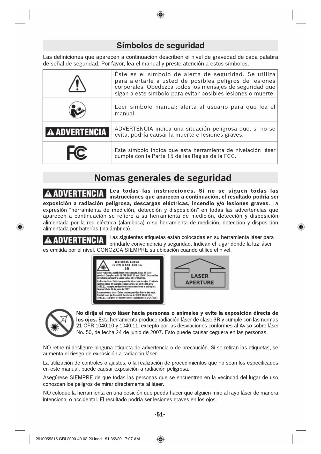 2610055315 GRL2000-40 02-20.indd 50 3/2/20 7:07 AM-51- Lea todas las instrucciones. Si no se siguen todas las instrucciones que aparecen a continuación, el resultado podría ser exposición a radiación peligrosa, descargas eléctricas, incendio y/o lesiones graves. La expresión “herramienta de medición, detección y disposición” en todas las advertencias que aparecen a continuación se refiere a su herramienta de medición, detección y disposición alimentada por la red eléctrica (alámbrica) o su herramienta de medición, detección y disposición alimentada por baterías (inalámbrica). Las siguientes etiquetas están colocadas en su herramienta láser para brindarle conveniencia y seguridad. Indican el lugar donde la luz láser es emitida por el nivel. CONOZCA SIEMPRE su ubicación cuando utilice el nivel. No dirija el rayo láser hacia personas o animales y evite la exposición directa de los ojos. Esta herramienta produce radiación láser de clase 3R y cumple con las normas 21 CFR 1040.10 y 1040.11, excepto por las desviaciones conformes al Aviso sobre láser No. 50, de fecha 24 de junio de 2007. Esto puede causar ceguera en las personas. NO retire ni desfigure ninguna etiqueta de advertencia o de precaución. Si se retiran las etiquetas, se aumenta el riesgo de exposición a radiación láser. La utilización de controles o ajustes, o la realización de procedimientos que no sean los especificados en este manual, puede causar exposición a radiación peligrosa. Asegúrese SIEMPRE de que todas las personas que se encuentren en la vecindad del lugar de uso conozcan los peligros de mirar directamente al láser. NO coloque la herramienta en una posición que pueda hacer que alguien mire al rayo láser de manera intencional o accidental. El resultado podría ser lesiones graves en los ojos. Nomas generales de seguridad Símbolos de seguridad Las definiciones que aparecen a continuación describen el nivel de gravedad de cada palabra de señal de seguridad. Por favor, lea el manual y preste atención a estos símbolos. Éste es el símbolo de alerta de seguridad. Se utiliza para alertarle a usted de posibles peligros de lesiones corporales. Obedezca todos los mensajes de seguridad que sigan a este símbolo para evitar posibles lesiones o muerte. Leer símbolo manual: alerta al usuario para que lea el manual. ADVERTENCIA indica una situación peligrosa que, si no se evita, podría causar la muerte o lesiones graves. Este símbolo indica que esta herramienta de nivelación láser cumple con la Parte 15 de las Reglas de la FCC. 2610055315 GRL2000-40 02-20.indd 51 3/2/20 7:07 AM-52- Posicione SIEMPRE la herramienta de manera segura. Si la herramienta falla, el resultado podría ser daños a la misma y/o lesiones graves al usuario. Utilice SIEMPRE sólo los accesorios que estén recomendados por el fabricante de su herramienta. El uso de accesorios que hayan sido diseñados para utilizarse con otras herramientas podría causar lesiones graves. NO utilice esta herramienta para propósitos que no sean los indicados en este manual. Si lo hace, el resultado podría ser lesiones graves. NO deje la herramienta láser “ENCENDIDA” desatendida en ningún modo de funcionamiento. NO desarme la herramienta. En su interior no hay piezas reparables ni reemplazables por el usuario. No modifique el producto de ninguna manera. Si se modifica la herramienta, el resultado podría ser exposición a radiación láser peligrosa. NO utilice los anteojos de visión láser como anteojos de seguridad. Los anteojos de visión láser se utilizan para mejorar la visualización del rayo láser, pero no protegen contra la radiación láser. NO utilice los anteojos de visión láser como lentes de sol o en tráfico. Los anteojos de visión láser no ofrecen protección completa contra los rayos UV y reducen la percepción de los colores. NO use herramientas ópticas, tales como, pero no limitadas a, telescopios o telescopios meridianos, para ver el rayo láser. El resultado podría ser lesiones graves en los ojos. NO mire directamente al rayo láser ni proyecte el rayo láser directamente a los ojos de otras personas. El resultado podría ser lesiones graves en los ojos. Seguridad en el área de trabajo Mantenga el área de trabajo limpia y bien iluminada. Las áreas desordenadas u oscuras invitan a que se produzcan accidentes. NO utilice la herramienta láser cerca de niños ni deje que los niños utilicen la herramienta láser. El resultado podría ser lesiones graves en los ojos. Seguridad eléctrica Las baterías pueden explotar o tener fugas y causar lesiones o incendios. Para reducir este riesgo, siga siempre todas las instrucciones y advertencias que están en la etiqueta y en el paquete de las baterías. DO NOT expose the laser tool and battery to rain or wet conditions. Water entering laser tool will increase the risk of fire and personal injury. NO haga cortocircuito en los terminales de las baterías. NO cargue baterías alcalinas. NO mezcle baterías viejas y nuevas. Reemplace todas las baterías al mismo tiempo con baterías nuevas de la misma marca y el mismo tipo. NO mezcle las químicas de las baterías. Deseche o recicle las baterías de acuerdo con el código local. NO deseche las baterías en un fuego. Mantenga las baterías fuera del alcance de los niños. Retire las baterías si el dispositivo no se va a usar durante varios meses. Seguridad personal Manténgase alerta, fíjese en lo que está haciendo y use el sentido común cuando utilice una herramienta. No utilice una herramienta mientras esté cansado o bajo la influencia de drogas, alcohol o medicamentos. Un momento de descuido mientras se utiliza una herramienta puede causar lesiones personales graves o resultados de medición incorrectos. Use equipo de seguridad. Use siempre protección de los ojos. El equipo de seguridad, tal como una máscara antipolvo, zapatos de seguridad antideslizantes, casco o protección de la audición, u