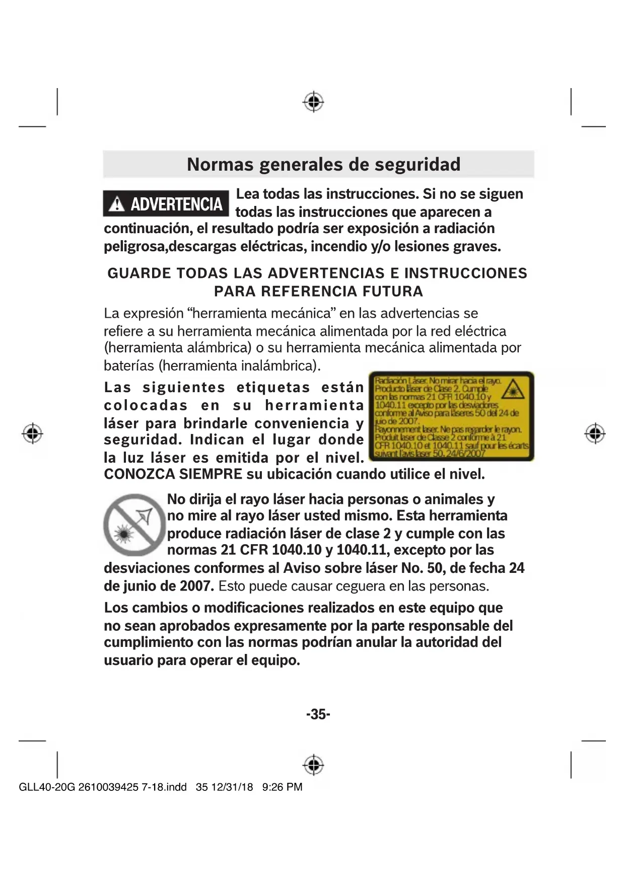 La expresión “herramienta mecánica” en las advertencias se refiere a su herramienta mecánica alimentada por la red eléctrica (herramienta alámbrica) o su herramienta mecánica alimentada por baterías (herramienta inalámbrica). Las siguientes etiquetas están colocadas en su herramienta láser para brindarle conveniencia y seguridad. Indican el lugar donde la luz láser es emitida por el nivel. CONOZCA SIEMPRE su ubicación cuando utilice el nivel. No dirija el rayo láser hacia personas o animales y no mire al rayo láser usted mismo. Esta herramienta produce radiación láser de clase 2 y cumple con las normas 21 CFR 1040.10 y 1040.11, excepto por las desviaciones conformes al Aviso sobre láser No. 50, de fecha 24 de junio de 2007. Esto puede causar ceguera en las personas. Los cambios o modificaciones realizados en este equipo que no sean aprobados expresamente por la parte responsable del cumplimiento con las normas podrían anular la autoridad del usuario para operar el equipo.