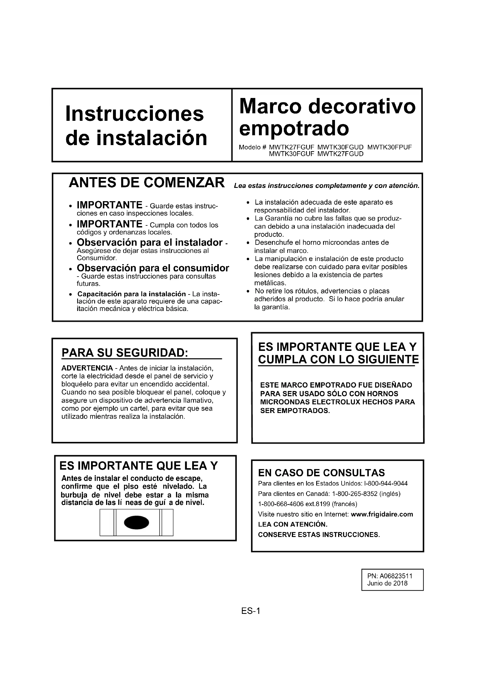 - Capacitación para la instalación - La insta- lación de este aparato requiere de una capac-itación mecánica y eléctrica básica.ADVERTENCIA - Antes de iniciar la instalación, corte la electricidad desde el panel de servicio y bloquéelo para evitar un encendido accidental.Cuando no sea posible bloquear el panel, coloque y asegure un dispositivo de advertencia llamativo, como por ejemplo un cartel, para evitar que sea utilizado mientras realiza la instalación.ESTE MARCO EMPOTRADO FUE DISEÑADO PARA SER USADO SÓLO CON HORNOS MICROONDAS ELECTROLUX HECHOS PARA SER EMPOTRADOS. Para clientes en los Estados Unidos: l-800-944-9044 Para clientes en Canadá: 1-800-265-8352 (inglés) 1-800-668-4606 ext.8199 (francés) Visite nuestro sitio en Internet: www.frigidaire.com LEA CON ATENCIÓN. CONSERVE ESTAS INSTRUCCIONES.