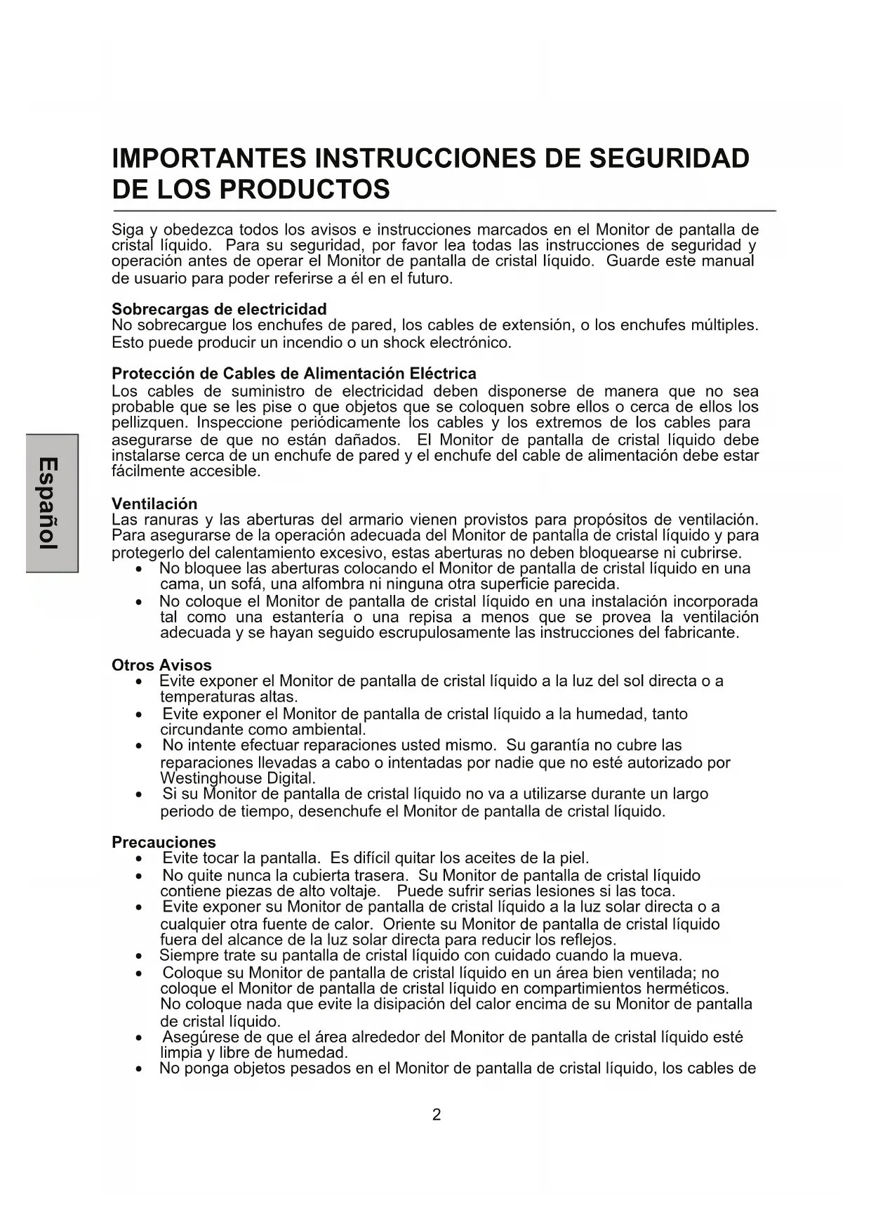 Los cables de suministro de electricidad deben disponerse de manera que no sea probable que se les pise o que objetos que se coloquen sobre ellos o cerca de ellos los pellizquen. Inspeccione periódicamente los cables y los extremos de los cables para asegurarse de que no están dañados. El Monitor de pantalla de cristal líquido debe instalarse cerca de un enchufe de pared y el enchufe del cable de alimentación debe estar fácilmente accesible. Ventilación Las ranuras y las aberturas del armario vienen provistos para propósitos de ventilación. Para asegurarse de la operación adecuada del Monitor de pantalla de cristal líquido y para protegerlo del calentamiento excesivo, estas aberturas no deben bloquearse ni cubrirse. x No bloquee las aberturas colocando el Monitor de pantalla de cristal líquido en una cama, un sofá, una alfombra ni ninguna otra superficie parecida. x No coloque el Monitor de pantalla de cristal líquido en una instalación incorporada tal como una estantería o una repisa a menos que se provea la ventilación adecuada y se hayan seguido escrupulosamente las instrucciones del fabricante. Otros Avisos x Evite exponer el Monitor de pantalla de cristal líquido a la luz del sol directa o a temperaturas altas. x Evite exponer el Monitor de pantalla de cristal líquido a la humedad, tanto circundante como ambiental. x No intente efectuar reparaciones usted mismo. Su garantía no cubre las reparaciones llevadas a cabo o intentadas por nadie que no esté autorizado por Westinghouse Digital. x Si su Monitor de pantalla de cristal líquido no va a utilizarse durante un largo periodo de tiempo, desenchufe el Monitor de pantalla de cristal líquido. Precauciones x Evite tocar la pantalla. Es difícil quitar los aceites de la piel. x No quite nunca la cubierta trasera. Su Monitor de pantalla de cristal líquido contiene piezas de alto voltaje. Puede sufrir serias lesiones si las toca. x Evite exponer su Monitor de pantalla de cristal líquido a la luz solar directa o a cualquier otra fuente de calor. Oriente su Monitor de pantalla de cristal líquido fuera del alcance de la luz solar directa para reducir los reflejos. x Siempre trate su pantalla de cristal líquido con cuidado cuando la mueva. x Coloque su Monitor de pantalla de cristal líquido en un área bien ventilada; no coloque el Monitor de pantalla de cristal líquido en compartimientos herméticos. No coloque nada que evite la disipación del calor encima de su Monitor de pantalla de cristal líquido. x Asegúrese de que el área alrededor del Monitor de pantalla de cristal líquido esté limpia y libre de humedad. x No ponga objetos pesados en el Monitor de pantalla de cristal líquido, los cables de3 video, o el cable de electricidad. x Si el Monitor de pantalla de cristal líquido emite humo, ruido anormal, u olor extraño, apáguelo inmediatamente y póngase en contacto con el Centro de Servicio de Westinghouse. x AVISO – ¡Para Reducir El Riesgo De Incendio O De Shock Eléctrico, No Exponga El Monitor De Pantalla De Cristal Líquido A La Lluvia O A La Humedad! El Monitor de pantalla de cristal líquido no debe exponerse a goteos o salpicaduras, y no deben ponerse en el Monitor objetos que estén llenos de líquido, tales como los jarrones. EspañolReglas de Seguridad PRECAUCIÓN: El enchufe de suministro de electricidad debe colocarse cerca del Monitor de pantalla de cristal líquido y debe estar fácilmente accesible. Utilice siempre el cable de alimentación apropiado que está certificado para su país específico. Aquí abajo hay unos ejemplos: EE.UU...................UL Suiza .........SEVCanadá.................CSA Inglaterra....BASE/BS Alemania...............VDE Japón ........Acta de Control de Aparatos Eléctricos AVISO IMPORTANTE CON RESPECTO A LA SELECCIÓN DE CABLES DE ELECTRICIDAD