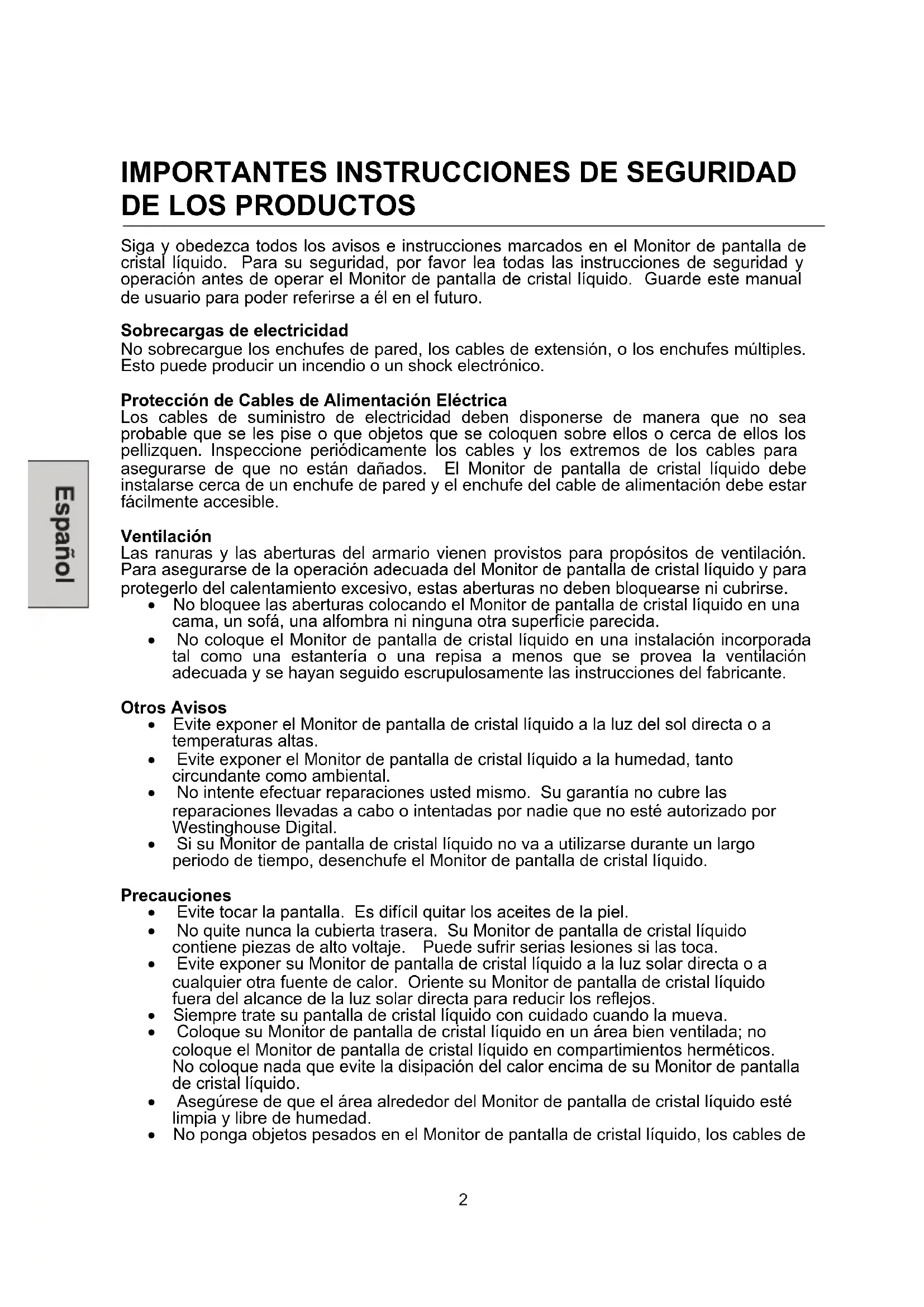Siga y obedezca todos los avisos e instrucciones marcados en el Monitor de pantalla de cristal líquido. Para su seguridad, por favor lea todas las instrucciones de seguridad y operación antes de operar el Monitor de pantalla de cristal líquido. Guarde este manual de usuario para poder referirse a él en el futuro. Sobrecargas de electricidad No sobrecargue los enchufes de pared, los cables de extensión, o los enchufes múltiples. Esto puede producir un incendio o un shock electrónico. Protección de Cables de Alimentación Eléctrica Los cables de suministro de electricidad deben disponerse de manera que no sea probable que se les pise o que objetos que se coloquen sobre ellos o cerca de ellos los pellizquen. Inspeccione periódicamente los cables y los extremos de los cables para asegurarse de que no están dañados. El Monitor de pantalla de cristal líquido debe instalarse cerca de un enchufe de pared y el enchufe del cable de alimentación debe estar fácilmente accesible. Ventilación Las ranuras y las aberturas del armario vienen provistos para propósitos de ventilación. Para asegurarse de la operación adecuada del Monitor de pantalla de cristal líquido y para protegerlo del calentamiento excesivo, estas aberturas no deben bloquearse ni cubrirse. x No bloquee las aberturas colocando el Monitor de pantalla de cristal líquido en una cama, un sofá, una alfombra ni ninguna otra superficie parecida. x No coloque el Monitor de pantalla de cristal líquido en una instalación incorporada tal como una estantería o una repisa a menos que se provea la ventilación adecuada y se hayan seguido escrupulosamente las instrucciones del fabricante. Otros Avisos x Evite exponer el Monitor de pantalla de cristal líquido a la luz del sol directa o a temperaturas altas. x Evite exponer el Monitor de pantalla de cristal líquido a la humedad, tanto circundante como ambiental. x No intente efectuar reparaciones usted mismo. Su garantía no cubre las reparaciones llevadas a cabo o intentadas por nadie que no esté autorizado por Westinghouse Digital. x Si su Monitor de pantalla de cristal líquido no va a utilizarse durante un largo periodo de tiempo, desenchufe el Monitor de pantalla de cristal líquido. Precauciones x Evite tocar la pantalla. Es difícil quitar los aceites de la piel. x No quite nunca la cubierta trasera. Su Monitor de pantalla de cristal líquido contiene piezas de alto voltaje. Puede sufrir serias lesiones si las toca. x Evite exponer su Monitor de pantalla de cristal líquido a la luz solar directa o a cualquier otra fuente de calor. Oriente su Monitor de pantalla de cristal líquido fuera del alcance de la luz solar directa para reducir los reflejos. x Siempre trate su pantalla de cristal líquido con cuidado cuando la mueva. x Coloque su Monitor de pantalla de cristal líquido en un área bien ventilada; no coloque el Monitor de pantalla de cristal líquido en compartimientos herméticos. No coloque nada que evite la disipación del calor encima de su Monitor de pantalla de cristal líquido. x Asegúrese de que el área alrededor del Monitor de pantalla de cristal líquido esté limpia y libre de humedad. x No ponga objetos pesados en el Monitor de pantalla de cristal líquido, los cables de 2video, o el cable de electricidad. x Si el Monitor de pantalla de cristal líquido emite humo, ruido anormal, u olor extraño, apáguelo inmediatamente y póngase en contacto con el Centro de Servicio de Westinghouse. x AVISO – ¡Para Reducir El Riesgo De Incendio O De Shock Eléctrico, No Exponga El Monitor De Pantalla De Cristal Líquido A La Lluvia O A La Humedad! El Monitor de pantalla de cristal líquido no debe exponerse a goteos o salpicaduras, y no deben ponerse en el Monitor objetos que estén llenos de líquido, tales como los jarrones. 3Reglas de Seguridad PRECAUCIÓN: El enchufe de suministro de electricidad debe colocarse cerca del Monitor de pantalla de cristal líquido y debe estar fácilmente accesible. Utilice siempre el cable de alimentación apropiado que está certificado para su país específico. Aquí abajo hay unos ejemplos: EE.UU...................UL Suiza .........SEV Canadá.................CSA Inglaterra....BASE/BS Alemania...............VDE Japón ........Acta de Control de Aparatos Eléctricos AVISO IMPORTANTE CON RESPECTO A LA SELECCIÓN DE CABLES DE ELECTRICIDAD El cable eléctrico específico para este Monitor de pantalla de cristal líquido viene adjunto y se ha seleccionado de acuerdo con el país de destino y debe utilizarse para evitar el shock eléctrico. Utilice las reglas siguientes si es necesario reemplazar los cables originales, o si los cables no vienen adjuntos. El receptáculo hembra de los cables debe cumplir con los requisitos de IEC-60320 y debe tener el mismo aspecto que la Figura A1 de abajo: Figure A1 Figure A2 Para Estados Unidos y Canadá En Estados Unidos y Canadá, el enchufe macho es de estilo NEMA5-15 (Figura A2), con certificación UL, y con etiqueta de CSA (Commodity Substance Approvals – Materia Prima Aprobada). Para los Monitores de pantalla de cristal líquido que se coloquen en un escritorio o en una mesa pueden utilizarse cables de tipo SVT o SJT. Para los Monitores de pantalla de cristal líquido que se pongan directamente en el suelo pueden utilizarse solamente cables de tipo SJT. Los cables deben seleccionarse según la categoría de corriente del Monitor de pantalla de cristal líquido. Por favor consulte la tabla de abajo para ver el criterio de selección de los cables de electricidad utilizados en Estados Unidos y Canadá. Tipo de Cable Tamaño de los Conductores del Cable Categoría de Corriente Máxima de la Unidad SJT 18 AWG 16 AWG 14 AWG 10 Amps 12 Amps 12 Amps SVT 18 AWG 17 AWG 10 Amps 12 Amps Declaración de Cumplimiento con la FCC Este equipo se ha probado y cumple con los límites de un aparato digital de Clase B, de acuerdo con la parte 15 de las Reglas de la FCC (Federal Communications Commission