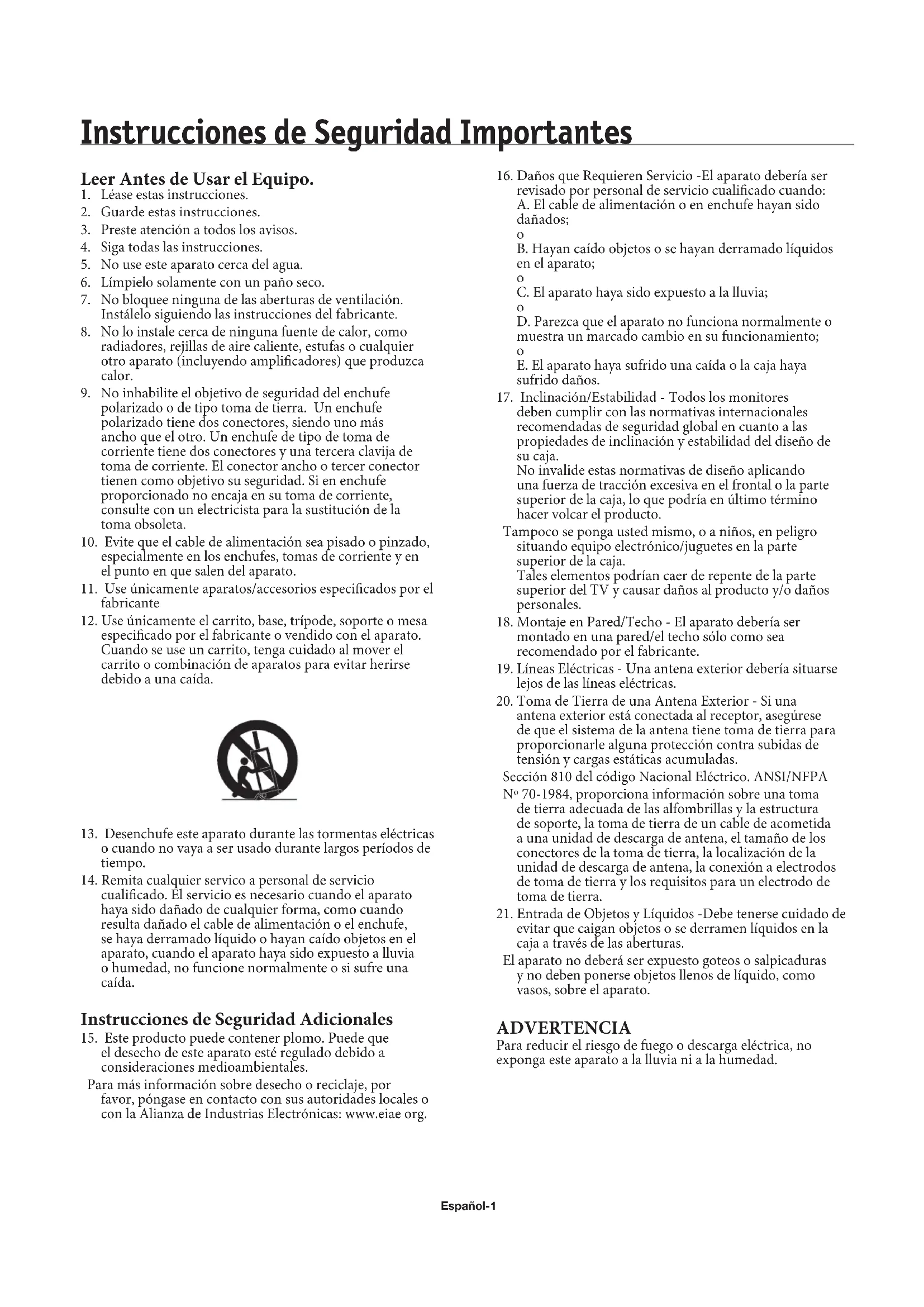 cualicado. El servicio es necesario cuando el aparato haya sido dañado de cualquier forma, como cuando resulta dañado el cable de alimentación o el enchufe, se haya derramado líquido o hayan caído objetos en el aparato, cuando el aparato haya sido expuesto a lluvia o humedad, no funcione normalmente o si sufre una caída. Instrucciones de Seguridad Adicionales