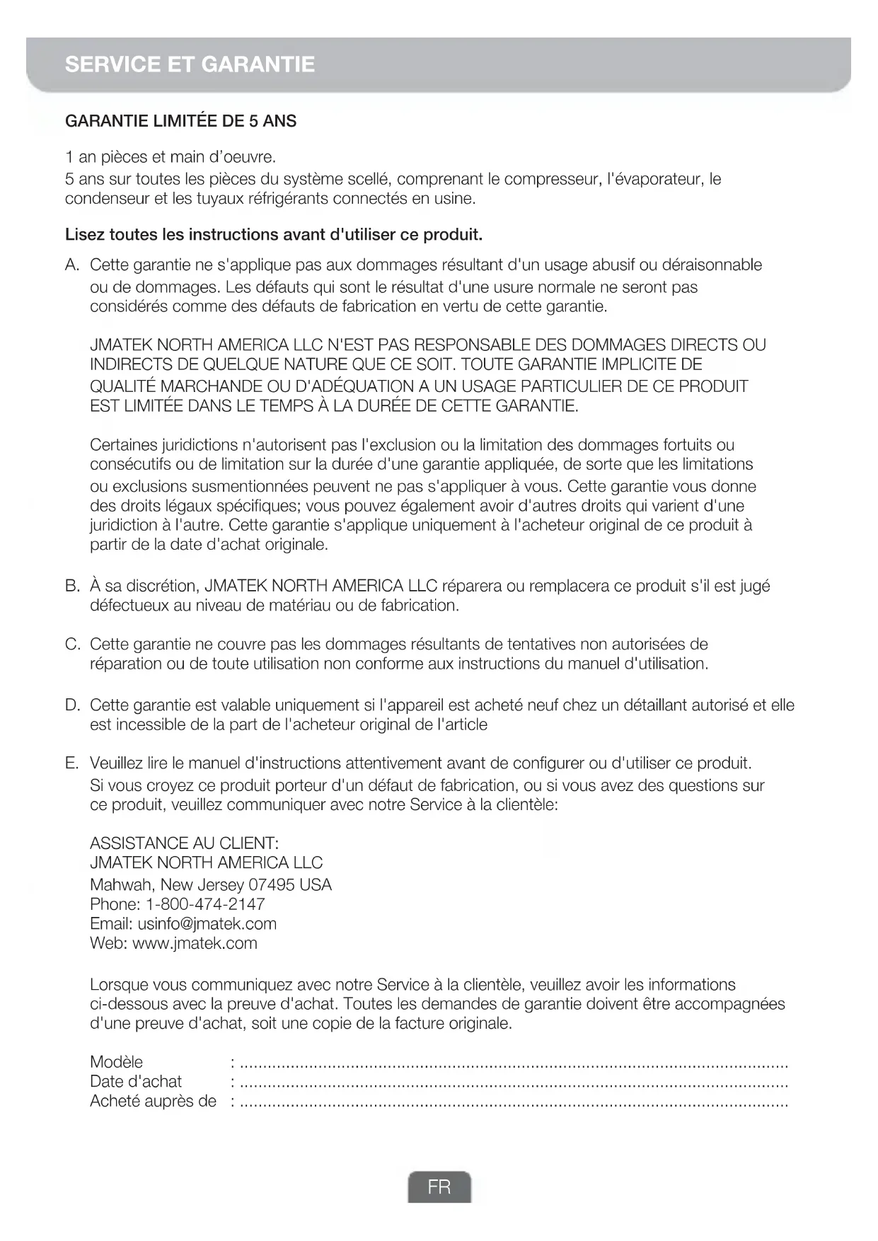 Esta garantía no aplica para cualquier daño resultante del uso comercia, abusivo, irracional o derivado de daños adicionales. Los defectos que sean resultado del desgaste normal por el uso no serán considerados como defectos de fábrica bajo esta garantía. JMATEK NORTH AMERICA LLC NO ES RESPONSABLE DE LOS DAÑOS SECUNDARIOS O DERIVADOS DE NINGUNA NATURALEZA. CUALQUIER GARANTÍA TÁCITA DE COMERCIABILIDAD O DE PREPARACIÓN PARA UN USO CONCRETO DE ESTE PRODUCTO QUEDA LIMITADA A LA DURACIÓN DE ESTA GARANTÍA. Algunas jurisdicciones no permiten la exclusión o limitación de daños incidentales o consecuentes o limitaciones sobre la duración de la garantía aplicada, por lo que las limitaciones o exclusiones anteriores podrían no aplicarse en su caso. Esta garantía le otorga derechos legales específicos, y usted también podría tener otros derechos que varían de una jurisdicción a otra. Esta garantía aplica solo al comprador original de este producto con la fecha original de compra. Dado el caso, JMATEK NORTH AMERICA LLC reparará o sustituirá este producto si se detecta algún defecto de material o de manipulación. La garantía no cubre el daño causado por cualquier intento no autorizado de reparar el producto, ni el derivado de no utilizarlo de acuerdo con el manual de instrucciones. Esta garantía aplica solo si la unidad es adquirida, nueva, de un distribuidor autorizado y no es transferible del comprador original del producto. Por favor, lea el manual de instrucciones detenidamente antes de configurar o de utilizar este producto. Si considera que este producto sufre un defecto de fabricación, o si tiene dudas sobre el mismo, por favor contacte con nuestro Servicio de Atención al Cliente: SERVICIO DE ATENCIÓN A CLIENTES: JMATEK North America LLC Mahwah, New Jersey 07495 USA Phone: 1-800-474-2147 Email: usinfo@jmatek.com Web: www.jmatek.com Cuando contacte con nuestro Servicio de Atención al Cliente, por favor tenga la siguiente información preparada como prueba de compra. Todas las solicitudes de cobertura de la garantía tendrán que ir acompañadas de una prueba de compra, que será una copia de la factura original. : ....................................................................................................................... : ....................................................................................................................... : ....................................................................................................................... Modelo: Fecha de compra Adquirido en