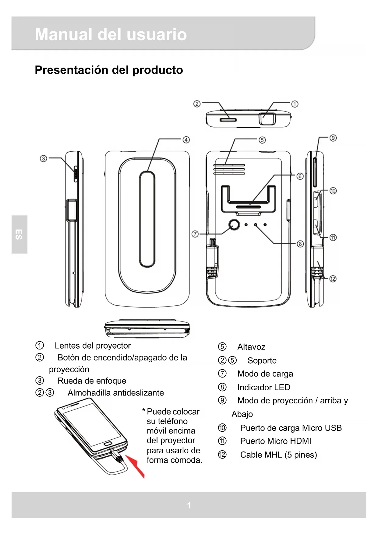Presentación del producto ུ Altavoz ཱུ Soporte ྲྀ Modo de carga ཷ Indicador LED ླྀ Modo de proyección / arriba y Abajo ཹ Puerto de carga Micro USB ེ Puerto Micro HDMI ཻ Cable MHL (5 pines) Lentes del proyector ཱ Botón de encendido/apagado de la proyección ི Rueda de enfoque ཱི Almohadilla antideslizante