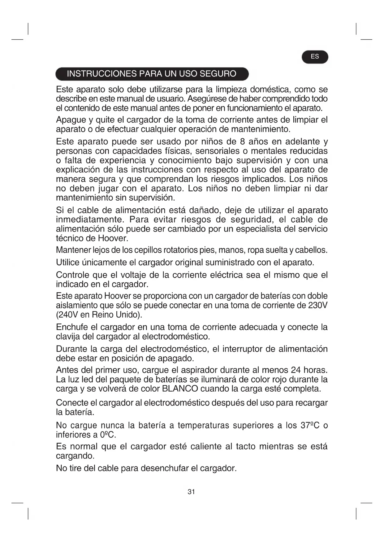 Este aparato solo debe utilizarse para la limpieza doméstica, como se describe en este manual de usuario. Asegúrese de haber comprendido todo el contenido de este manual antes de poner en funcionamiento el aparato. Apague y quite el cargador de la toma de corriente antes de limpiar el aparato o de efectuar cualquier operación de mantenimiento. Este aparato puede ser usado por niños de 8 años en adelante y personas con capacidades físicas, sensoriales o mentales reducidas o falta de experiencia y conocimiento bajo supervisión y con una explicación de las instrucciones con respecto al uso del aparato de manera segura y que comprendan los riesgos implicados. Los niños no deben jugar con el aparato. Los niños no deben limpiar ni dar mantenimiento sin supervisión. Si el cable de alimentación está dañado, deje de utilizar el aparato inmediatamente. Para evitar riesgos de seguridad, el cable de alimentación sólo puede ser cambiado por un especialista del servicio técnico de Hoover. Mantener lejos de los cepillos rotatorios pies, manos, ropa suelta y cabellos. Utilice únicamente el cargador original suministrado con el aparato. Controle que el voltaje de la corriente eléctrica sea el mismo que el indicado en el cargador. Este aparato Hoover se proporciona con un cargador de baterías con doble aislamiento que sólo se puede conectar en una toma de corriente de 230V (240V en Reino Unido). Enchufe el cargador en una toma de corriente adecuada y conecte la clavija del cargador al electrodoméstico. Durante la carga del electrodoméstico, el interruptor de alimentación debe estar en posición de apagado. Antes del primer uso, cargue el aspirador durante al menos 24 horas. La luz led del paquete de baterías se iluminará de color rojo durante la carga y se volverá de color BLANCO cuando la carga esté completa. Conecte el cargador al electrodoméstico después del uso para recargar la batería. No cargue nunca la batería a temperaturas superiores a los 37ºC o inferiores a 0ºC. Es normal que el cargador esté caliente al tacto mientras se está cargando. No tire del cable para desenchufar el cargador. ES32 Desenchufe el cargador en caso de ausencias prolongadas (vacaciones, etc.). Vuelva a cargar el aparato nuevamente antes de usarlo, ya que la batería se podría descargar durante períodos de almacenamiento prolongados. Si se debe desechar el aparato, primero es necesario extraer la batería. Cuando extraiga la batería, el electrodoméstico debe estar desconectado de la red eléctrica. Elimine la batería de manera segura. Haga funcionar el electrodoméstico hasta que se detenga debido a que la batería está totalmente descargada. Las baterías usadas deben llevarse a un punto de reciclaje y no deben desecharse con los residuos domésticos. Para quitar la batería, contacte con el Servicio Técnico de Hoover o siga las instrucciones presentes. IMPORTANTE: Descargue siempre las baterías completamente antes de desecharlas y asegúrese de que el cargador está desenchufado. Haga funcionar el aspirador hasta que las baterías estén completamente descargadas. Quite el conector jack del cargador del electrodoméstico. Pulse los botones de desenganche del paquete de baterías y deslice para extraerlo. [3] Nota: Si llega a experimentar problemas al desmontar el aspirador o para obtener información más detallada sobre el funcionamiento, la recuperación y el reciclaje de este electrodoméstico, contacte con su Ayuntamiento o con el servicio de recogida de residuos domésticos de su zona. Utilice únicamente accesorios, consumibles o repuestos recomendados o distribuidos por Hoover. Electricidad estática: Algunas alfombras pueden provocar una pequeña acumulación de electricidad estática. Las descargas estáticas no son peligrosas para la salud. No utilice el aparato al aire libre, en superficies húmedas o para recoger líquidos. No aspire objetos duros o afilados, cerillas, cenizas calientes, colillas de cigarrillo u objetos similares. No rocíe, ni aspire líquidos inflamables, aerosoles para limpiar o sus vapores. No pase por encima del cable de alimentación cuando utilice el aparato ni lo desenchufe tirando del cable. No siga utilizando el electrodoméstico o el cargador si parece estar defectuoso. Servicio Técnico de Hoover: Para garantizar el funcionamiento seguro, eficaz y duradero del aspirador, recomendamos que las tareas de