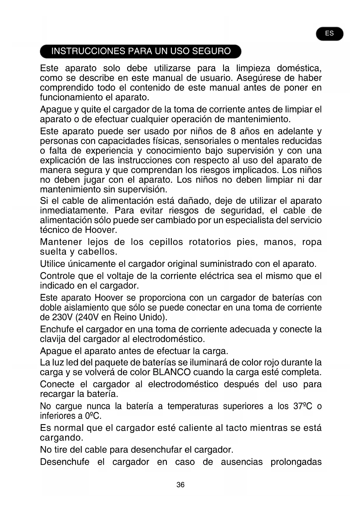 Este aparato solo debe utilizarse para la limpieza doméstica, como se describe en este manual de usuario. Asegúrese de haber comprendido todo el contenido de este manual antes de poner en funcionamiento el aparato. Apague y quite el cargador de la toma de corriente antes de limpiar el aparato o de efectuar cualquier operación de mantenimiento. Este aparato puede ser usado por niños de 8 años en adelante y personas con capacidades físicas, sensoriales o mentales reducidas o falta de experiencia y conocimiento bajo supervisión y con una explicación de las instrucciones con respecto al uso del aparato de manera segura y que comprendan los riesgos implicados. Los niños no deben jugar con el aparato. Los niños no deben limpiar ni dar mantenimiento sin supervisión. Si el cable de alimentación está dañado, deje de utilizar el aparato inmediatamente. Para evitar riesgos de seguridad, el cable de alimentación sólo puede ser cambiado por un especialista del servicio técnico de Hoover. Mantener lejos de los cepillos rotatorios pies, manos, ropa suelta y cabellos. Utilice únicamente el cargador original suministrado con el aparato. Controle que el voltaje de la corriente eléctrica sea el mismo que el indicado en el cargador. Este aparato Hoover se proporciona con un cargador de baterías con doble aislamiento que sólo se puede conectar en una toma de corriente de 230V (240V en Reino Unido). Enchufe el cargador en una toma de corriente adecuada y conecte la clavija del cargador al electrodoméstico. Apague el aparato antes de efectuar la carga. La luz led del paquete de baterías se iluminará de color rojo durante la carga y se volverá de color BLANCO cuando la carga esté completa. Conecte el cargador al electrodoméstico después del uso para recargar la batería. No cargue nunca la batería a temperaturas superiores a los 37ºC o inferiores a 0ºC. Es normal que el cargador esté caliente al tacto mientras se está cargando. No tire del cable para desenchufar el cargador. Desenchufe el cargador en caso de ausencias prolongadas ES37 (vacaciones, etc.). Vuelva a cargar el aparato nuevamente antes de usarlo, ya que la batería se podría descargar durante períodos de almacenamiento prolongados. Si se debe desechar el aparato, primero es necesario extraer la batería. Cuando extraiga la batería, el electrodoméstico debe estar desconectado de la corriente eléctrica. Elimine la batería de manera segura. Haga funcionar el electrodoméstico hasta que se detenga debido a que la batería esté totalmente descargada. Las baterías usadas deben llevarse a un punto de reciclaje y no deben desecharse con los residuos domésticos. Para quitar la batería, contacte con el Servicio Técnico de Hoover o siga las instrucciones presentes. IMPORTANTE: Descargue siempre las baterías completamente antes de desecharlas y asegúrese de que el cargador está desenchufado. Haga funcionar el aspirador hasta que las baterías estén completamente descargadas. Quite el conector jack del cargador del electrodoméstico. Pulse los botones de desenganche del paquete de baterías y deslice para extraerlo. Nota: Si llega a experimentar problemas al desmontar el aspirador o para obtener más información sobre el funcionamiento, la recuperación y el reciclaje de este electrodoméstico, contacte con su Ayuntamiento o con el servicio de recogida de residuos domésticos de su zona. Utilice únicamente accesorios, consumibles o repuestos recomendados o distribuidos por Hoover. Electricidad estática: Algunas alfombras pueden provocar una pequeña acumulación de electricidad estática. Las descargas estáticas no son peligrosas para la salud. No utilice el aparato al aire libre, en superficies húmedas o para recoger líquidos. No aspire objetos duros o afilados, cerillas, cenizas calientes, colillas de cigarrillo u objetos similares. No rocíe, ni aspire líquidos inflamables, aerosoles para limpiar o sus vapores. No pase por encima del cable de alimentación cuando utilice el aparato ni lo desenchufe tirando del cable. No siga utilizando el electrodoméstico o el cargador si parece estar defectuoso. Servicio Técnico de Hoover: Para garantizar el funcionamiento seguro, eficaz y duradero del aspirador, recomendamos que las tareas de mantenimiento sean realizadas exclusivamente por técnicos autorizados del servicio Técnico de Hoover.