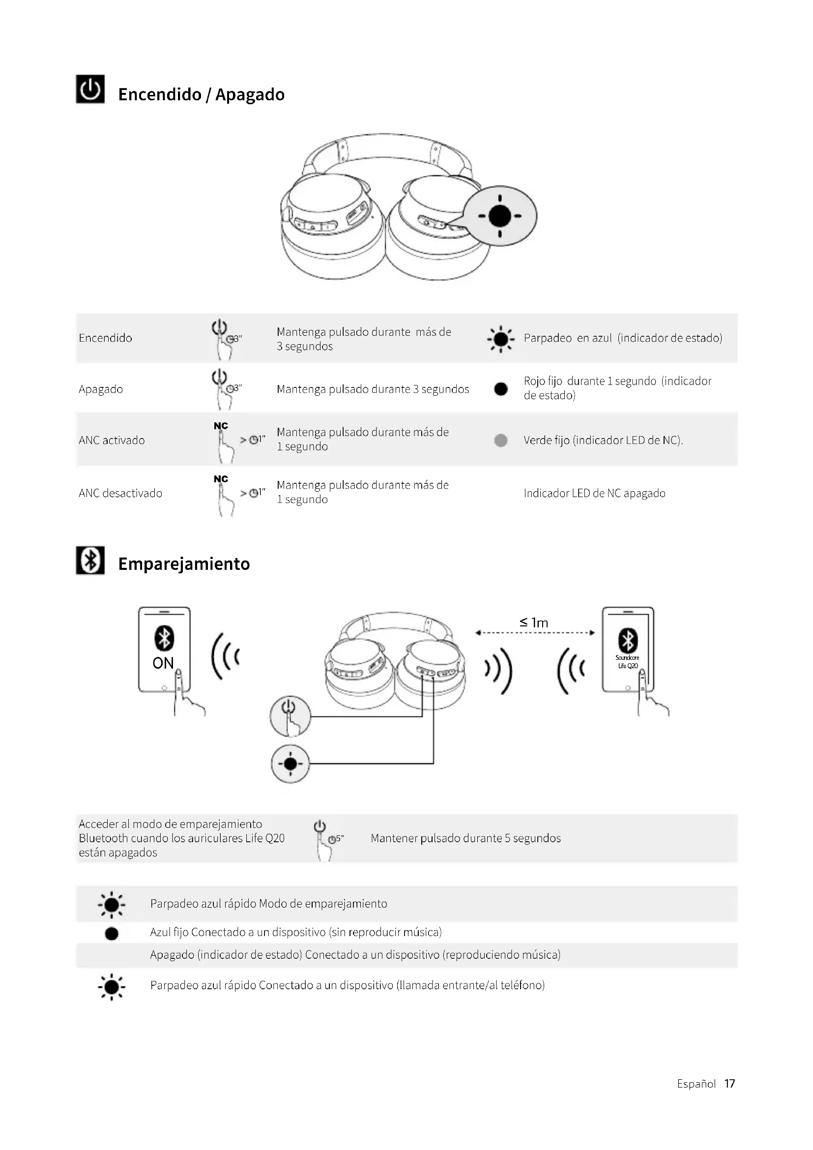 Mantenga pulsado durante 1 segundo Activar Siri / otro software de control por vozEspañol 19 Modo Aux AUX AUX Al conectar un cable de audio se activará automáticamente el modo AUX y se desactivará el modo ANC. Carga de los auriculares Sonido de notificación (tono): Solo quedan 2 horas de reproducción. Oirás un aviso de voz cada 30 minutos. Batería baja Parpadeo en rojo una vez en cada 60 segundos (indicador de estado) Rojo fijo (indicador de estado)) Cargando Nota: No encienda el Life Q20 mientras se carga. Apagado (indicador de estado) Carga completa20 Español Especificaciones Las especificaciones están sujetas a cambios sin previo aviso. Entrada 5 V 0,65 A Impedancia 16 Ω Tiempo de carga 3 horas Controlador (alcance total) 40 mm x 2 Reproducción (Bluetooth con modo ANC activado) 40 horas Respuesta en frecuencia 16 Hz - 40 KHz Reproducción (Bluetooth con modo ANC desactivado 60 horas Versión de Bluetooth V 5.0 Reproducción (conectado a un cable de audio con modo ANC activado) 35 horas Alcance 15 m Peso 268 gSuomi 21 Virta päälle / pois Virta päälle