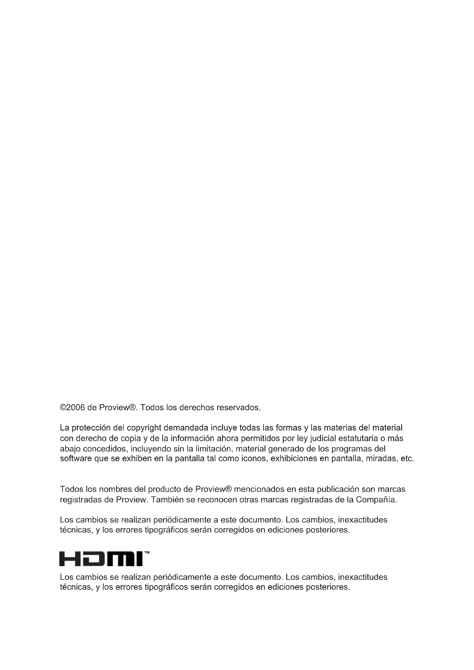 POIDS 66 lbs©2006 de Proview®. Todos los derechos reservados. La protección del copyright demandada incluye todas las formas y las materias del material con derecho de copia y de la información ahora permitidos por ley judicial estatutaria o más abajo concedidos, incluyendo sin la limitación, material generado de los programas del software que se exhiben en la pantalla tal como iconos, exhibiciones en pantalla, miradas, etc. Todos los nombres del producto de Proview® mencionados en esta publicación son marcas registradas de Proview. También se reconocen otras marcas registradas de la Compañía. Los cambios se realizan periódicamente a este documento. Los cambios, inexactitudes técnicas, y los errores tipográficos serán corregidos en ediciones posteriores. Los cambios se realizan periódicamente a este documento. Los cambios, inexactitudes técnicas, y los errores tipográficos serán corregidos en ediciones posteriores.ENGLISH ESPAÑOL