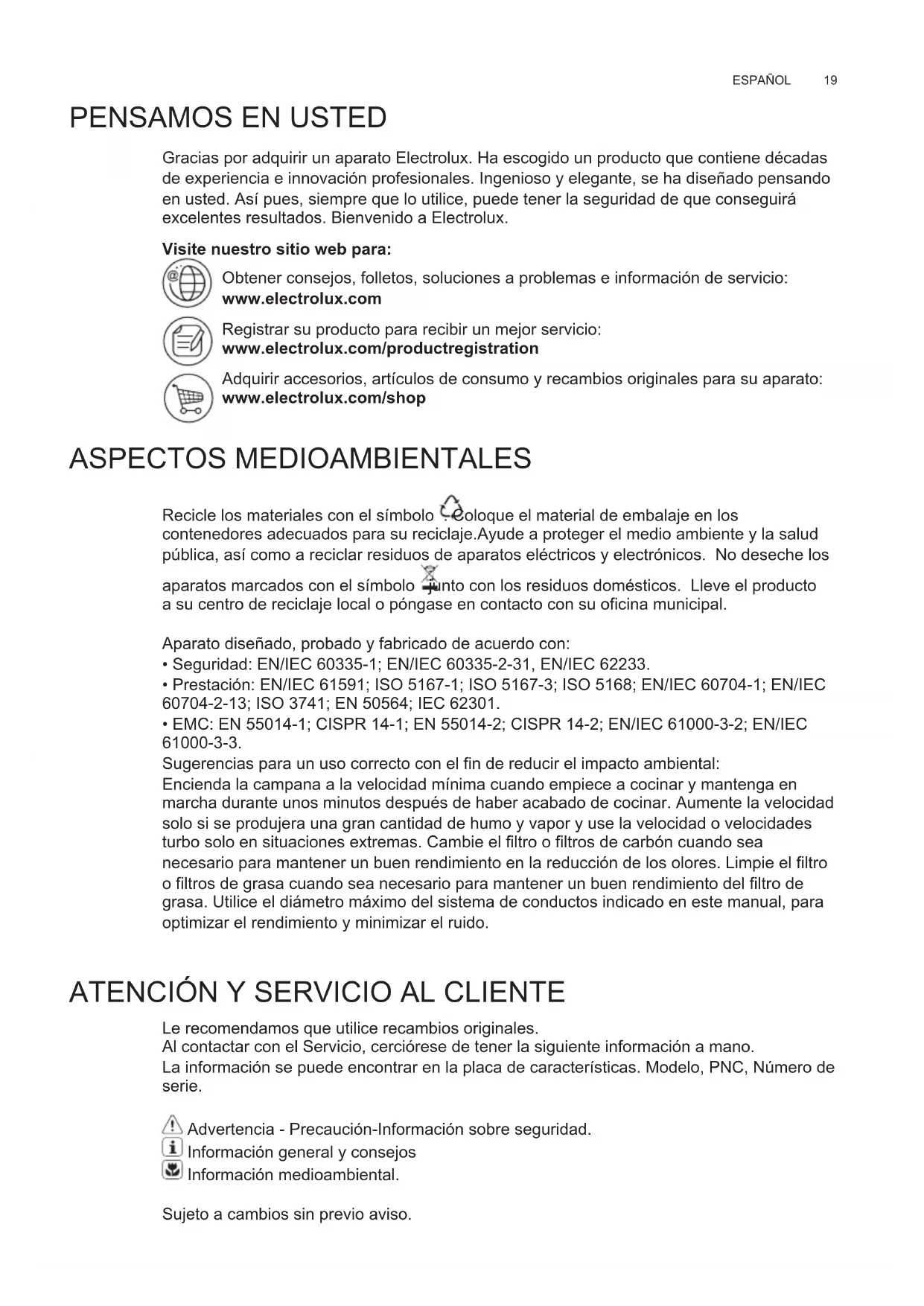 Le recomendamos que utilice recambios originales. Al contactar con el Servicio, cerciórese de tener la siguiente información a mano. La información se puede encontrar en la placa de características. Modelo, PNC, Número de serie. Advertencia - Precaución-Información sobre seguridad. Información general y consejos Información medioambiental. Sujeto a cambios sin previo aviso. ES MANUAL DE USOwww.electrolux.com