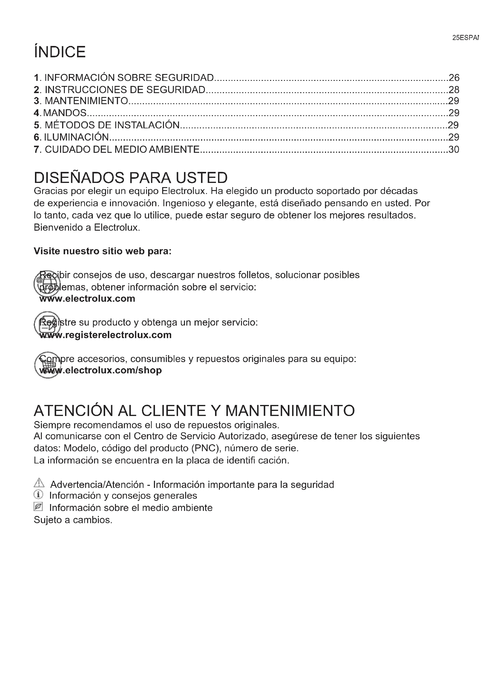Siempre recomendamos el uso de repuestos originales. Al comunicarse con el Centro de Servicio Autorizado, asegúrese de tener los siguientes datos: Modelo, código del producto (PNC), número de serie. La información se encuentra en la placa de identifi cación. Advertencia/Atención - Información importante para la seguridad Información y consejos generales Información sobre el medio ambiente Sujeto a cambios.26 www.electrolux.com