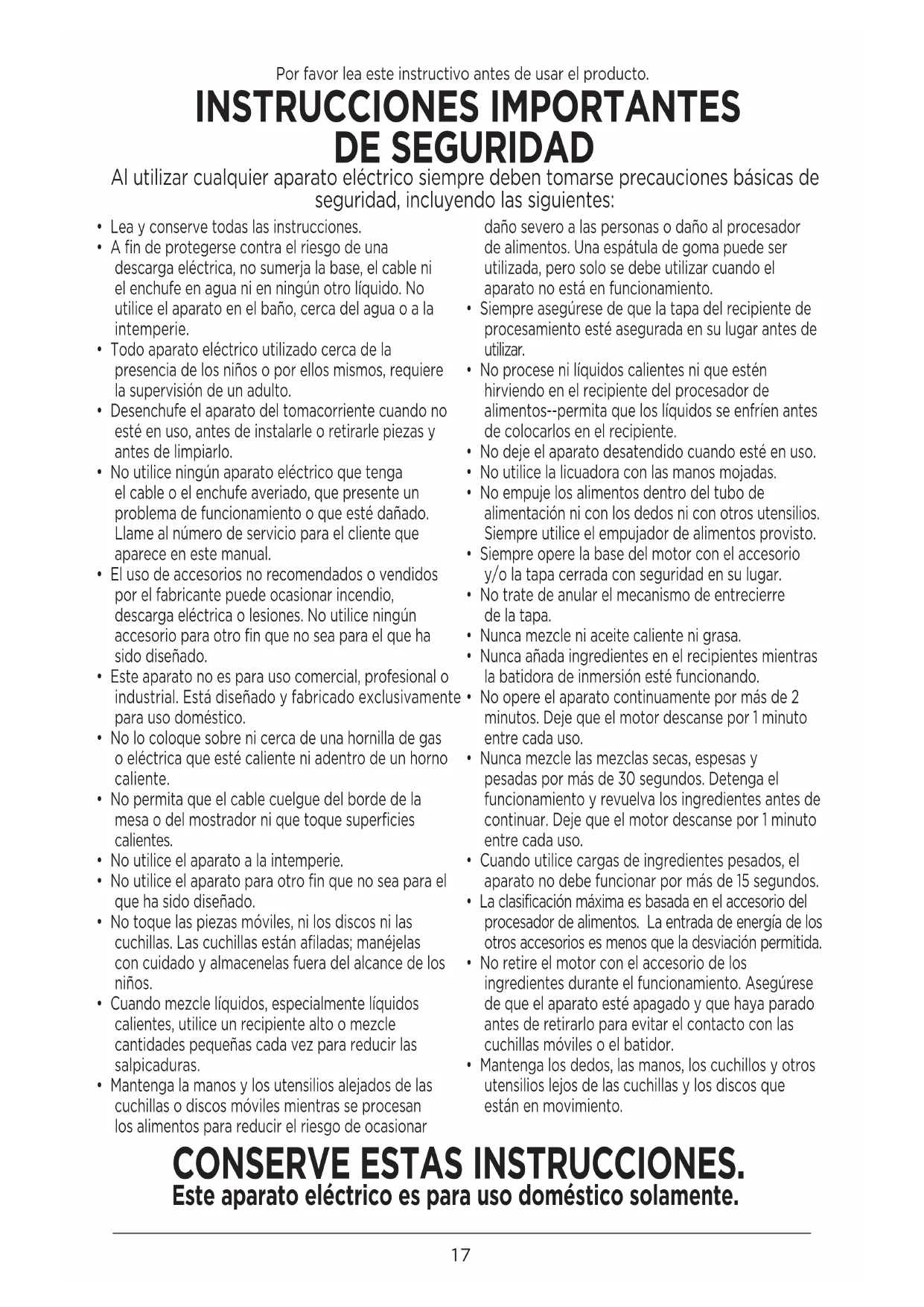 - Mantenga los dedos, las manos, los cuchillos y otros utensilios lejos de las cuchillas y los discos que están en movimiento. Por favor lea este instructivo antes de usar el producto. INSTRUCCIONES IMPORTANTES DE SEGURIDAD Al utilizar cualquier aparato eléctrico siempre deben tomarse precauciones básicas de seguridad, incluyendo las siguientes: CONSERVE ESTAS INSTRUCCIONES. Este aparato eléctrico es para uso doméstico solamente.18 ENCHUFE POLARIZADO (Solamente para los modelos de 120V) Este aparato cuenta con un enchufe polarizado (un contacto es más ancho que el otro). A fin de reducir el riesgo de un choque eléctrico, este enchufe encaja en un tomacorriente polarizada en un solo sentido. Si el enchufe no entra en el tomacorriente, inviértalo y si aun así no encaja, consulte con un electricista. Por favor no trate de alterar esta medida de seguridad.