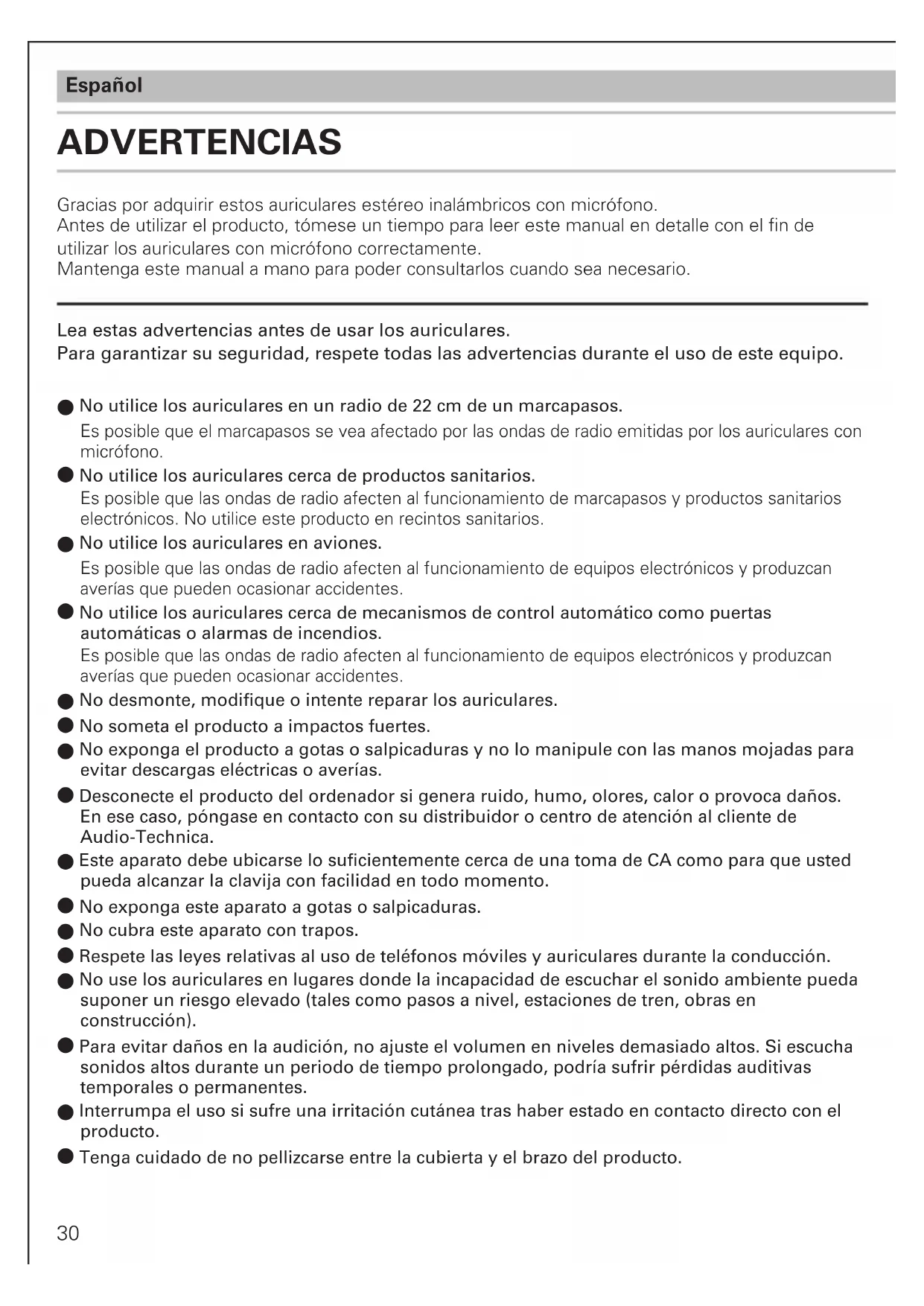 No utilice los auriculares cerca de productos sanitarios. Es posible que las ondas de radio afecten al funcionamiento de marcapasos y productos sanitarios electrónicos. No utilice este producto en recintos sanitarios.