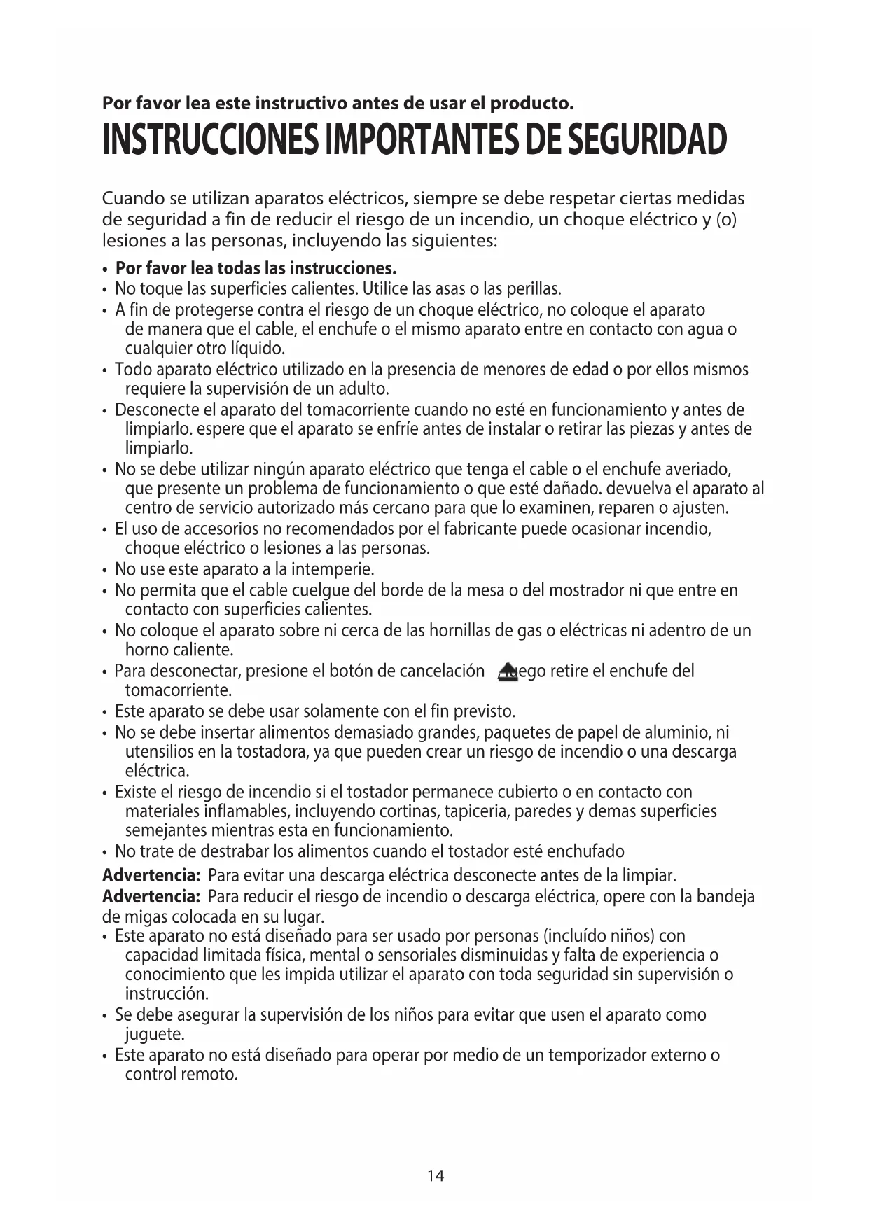 - No trate de destrabar los alimentos cuando el tostador esté enchufado Advertencia: Para evitar una descarga eléctrica desconecte antes de la limpiar. Advertencia: Para reducir el riesgo de incendio o descarga eléctrica, opere con la bandeja de migas colocada en su lugar.