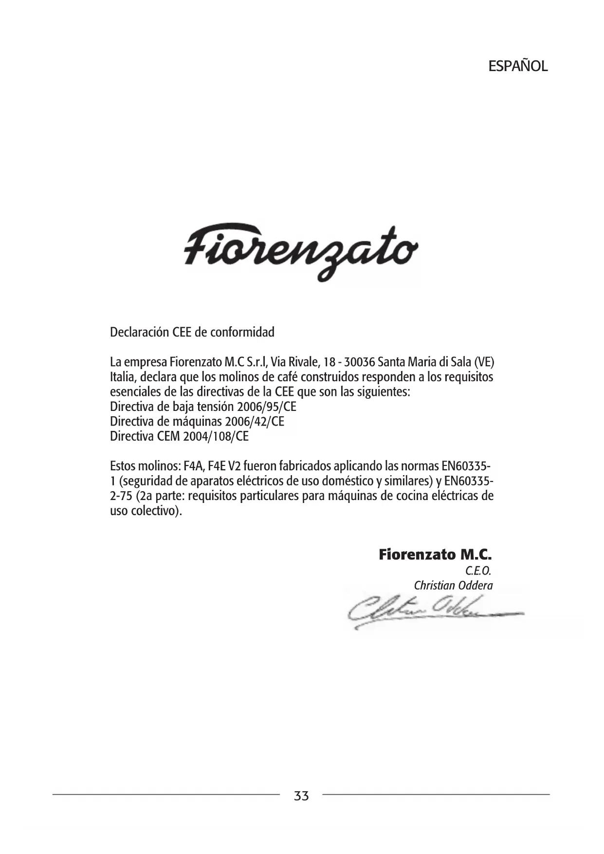 Desconecte la clavija para cortar la tensión de alimentación del aparato antes de co- menzar con las operaciones de limpieza. El aparato no se tiene que limpiar con chorros de agua. No instale el aparato en locales en el que esté prevista la limpieza mediante chorros de agua. Es imprescindible que la limpieza periódica del aparato sea llevada a cabo exclusivamente por personal técnico especializado. Para la limpieza utilice paños o pinceles perfectamente limpios e higieni- zados. No utilice productos abrasivos para que los detalles no pierdan su brillo original. Tolva Lave la tolva después de haberla sacado de¡ aparato (para ello destornille el tornillo de fijación correspondiente), con agua y jabón neutro, aclárela con agua templada y séquela perfectamente. Se aconseja lavar la tolva pe- riódicamente. Sistema de molido Extraiga el tornillo de seguridad que impide la extracción del anillo de regulación. Desen- rosque el anillo de regulación y gírelo hacia la derecha. Después de haber extraído el por- tamuelas superior, limpie las muelas, las ros- cas y todo el sistema de molido con la ayuda de un pincel y de un paño seco. Después de haber vuelto a colocar el portamuelas supe- rior en su alojamiento, enrosque el anillo de regulación, coloque de nuevo la tolva y fíjela adecuadamente, realice la regulación del gra- do de molido. LA DIRECTIVA 2002/96CE (RAEE): INFORMACIÓN PARA LOS USUARIOS Esta nota informativa está dirigida exclusiva- mente a los posesores de aparatos que tienen el símbolo de (Fig. A) en la etiqueta adhesiva que indica los datos técnicos, aplicada al pro- ducto (etiqueta con la matrícula): Este símbolo indica que el producto está clasificado, según las normas vigentes, como aparato eléctrico Fig. A40 o electrónico, y es conforme a la Directiva UE 2002/96/CE (RAEE). Por tanto, al final de su vida útil, se deberá eliminar por separado de los desechos domésticos, entregándolo gra- tuitamente a un centro de recogida selectiva para aparatos eléctricos y electrónicos, o bien, entregándolo al vendedor cuando se compre un aparato nuevo equivalente. Al final de la vida del aparato, el usuario es responsable de entregarlo a estructuras de recogida apro- piadas, so pena de las sanciones previstas por la legislación vigente en materia de residuos. Una adecuada recogida selectiva del aparato para luego reciclarlo, procesarlo y desguazar- lo de forma ecocompatible contribuye a evitar posibles efectos negativos para el medioam- biente y la salud, y favorece el reciclaje de los materiales que componen el producto. Para obtener información más detallada sobre los sistemas de recogida disponibles, contacte con el servicio local de desguace de residuos, o con la tienda donde compró el aparato. Los fabricantes y los importadores cumplen con su responsabilidad para el reciclaje, el procesa- miento y el desguace ecocompatible, directa- mente o participando en un sistema colectivo.41 Déclaration CEE de conformité La société Fiorenzato M.C. S.r.l., Via Rivale, 18 - 30036 Santa Maria di Sala (VE) Italie, déclare que les moulins-doseurs à café qu’elle fabrique sont conformes aux conditions essentielles requises par les Directives CEE suivantes: Basse tension 2006/95/EC Machines 2006/42/EC EMC 2004/108/EC Ces moulins-doseurs: F4A, F4E V2 ont été essayés en appliquant les normes EN60335-1 (sécurité des appareils électriques à usage domestique et simi- laires) et EN60335-2-75 (Partie II: norme spéciale pour les appareils de cuisine à usage collectif). Fiorenzato M.C. C.E.O. Christian Oddera FRANÇAIS42 INTRODUCTION Faire du café est un art et il faut suivre des règles précises pour en connaître tous les secrets. La méthode permettant d’obtenir une bonne tasse de café express est en effet plutôt complexe et l’appareil y joue un rôle très important Trois facteurs doivent nécessairement être associés pour que le résultat soit optimal et la qualité indiscutable: